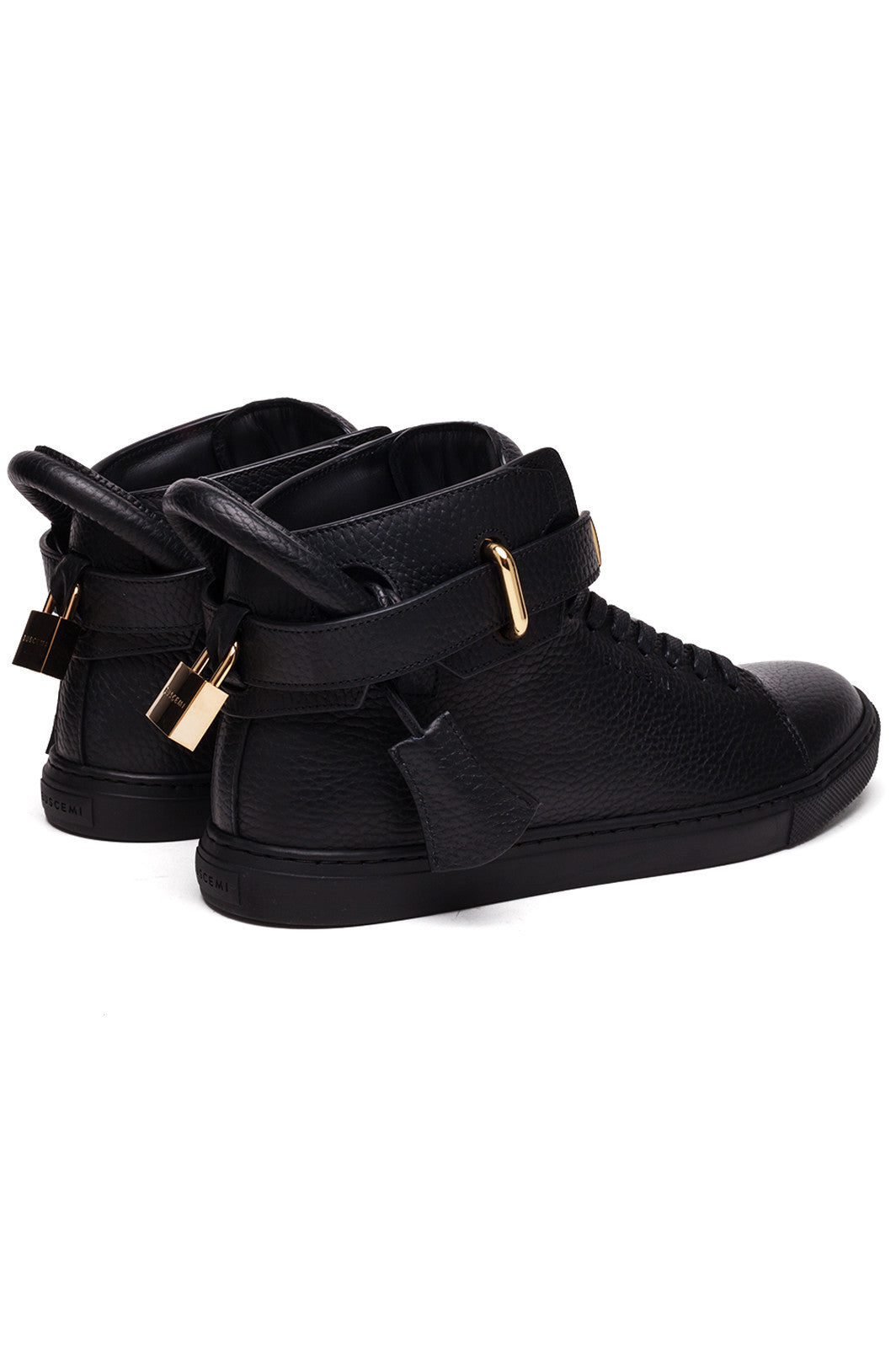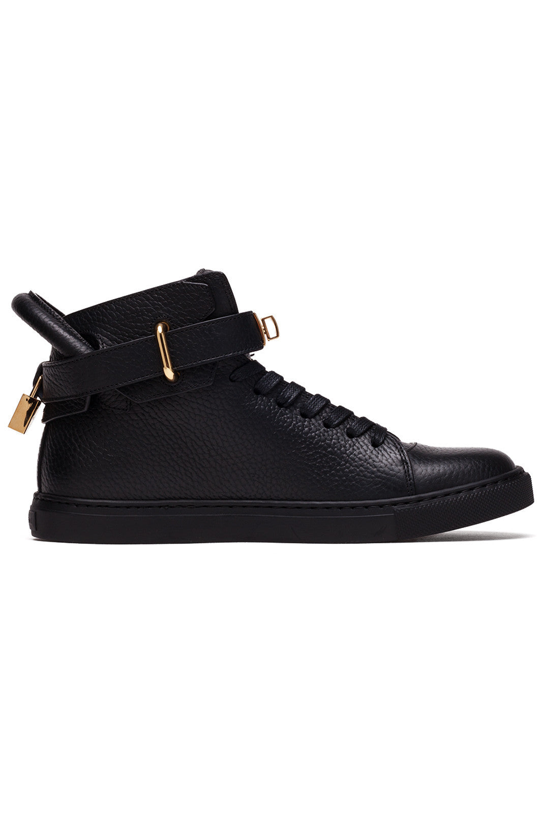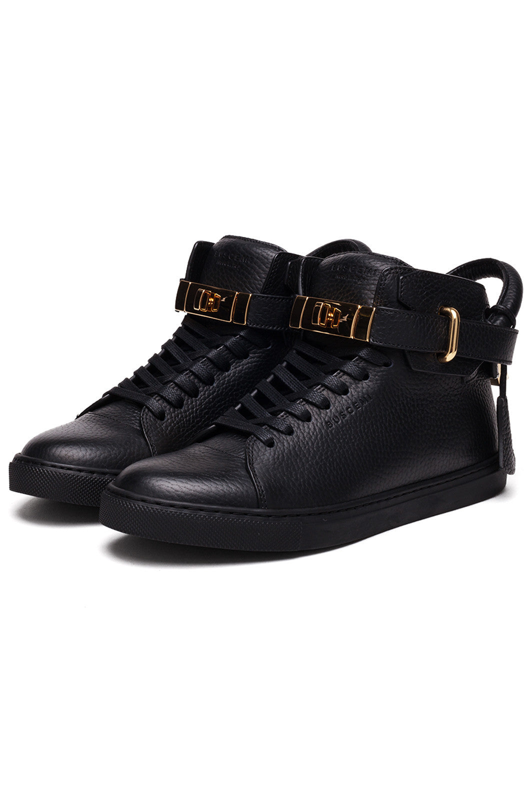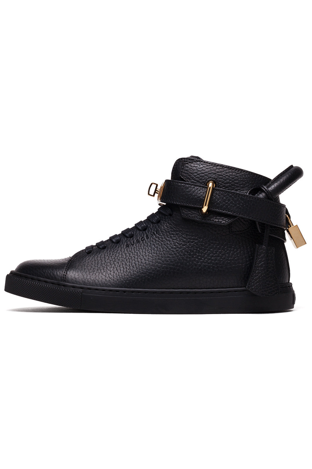 Hand crafted in Italy, the 100MM high-top sneaker is artfully constructed of full-grain Italian calf leather with hand painted edges and signature heel handle. The shoe is also paired with gold plated hardware featuring a 3-piece mechanical closure and lock. 100 millimeters in height.