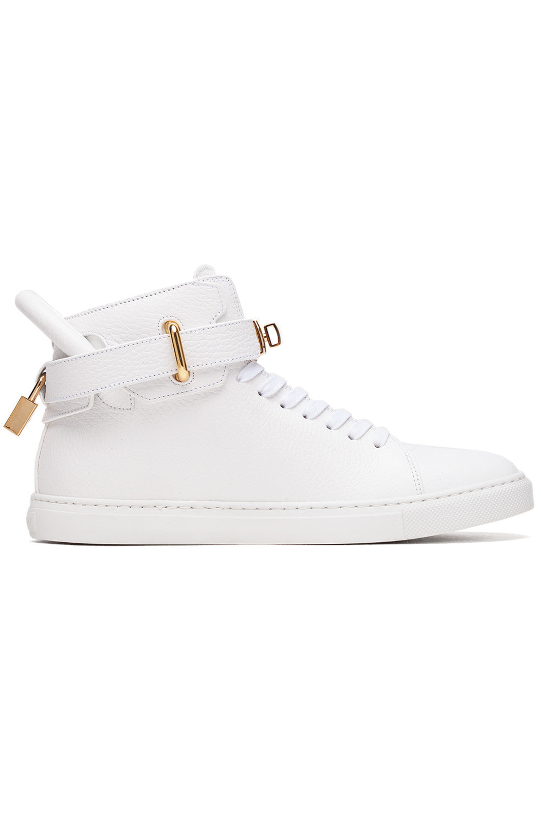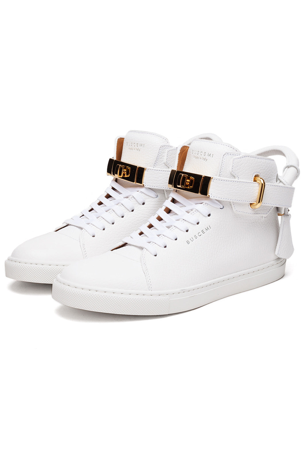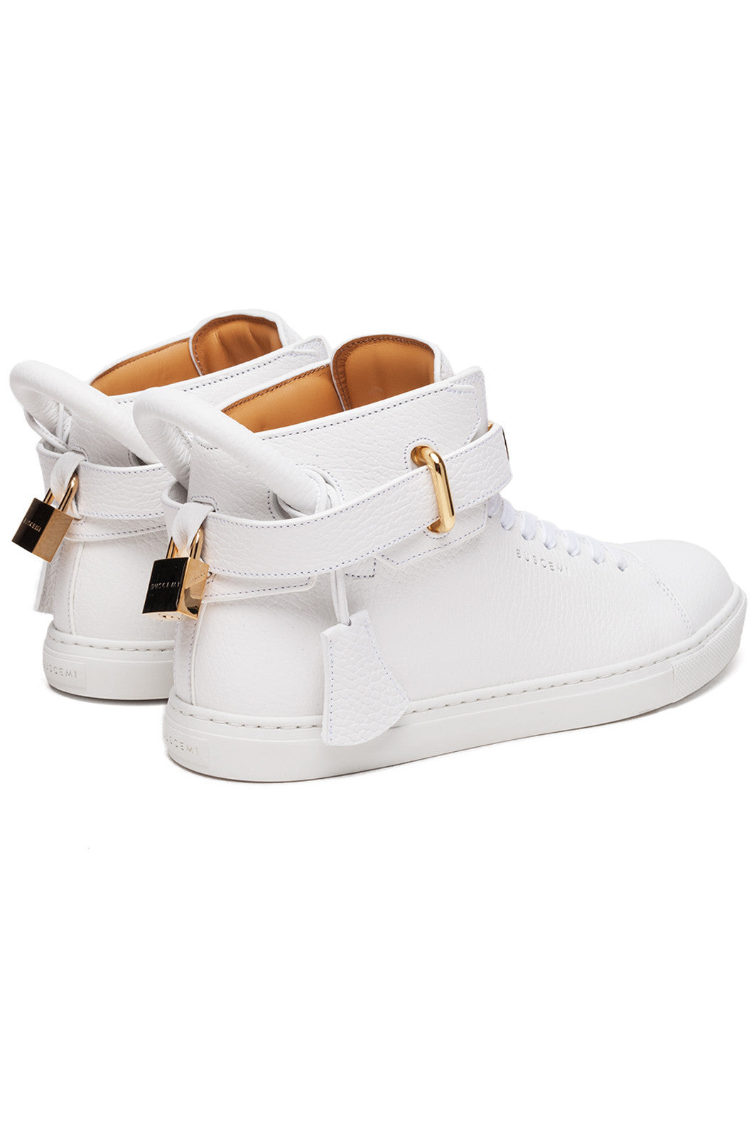 Hand crafted in Italy, the 100MM high-top sneaker is artfully constructed of full-grain Italian calf leather with hand painted edges and signature heel handle. The shoe is paired with gold plated hardware featuring a 3-piece closure and lock. 100 millimeters in height.