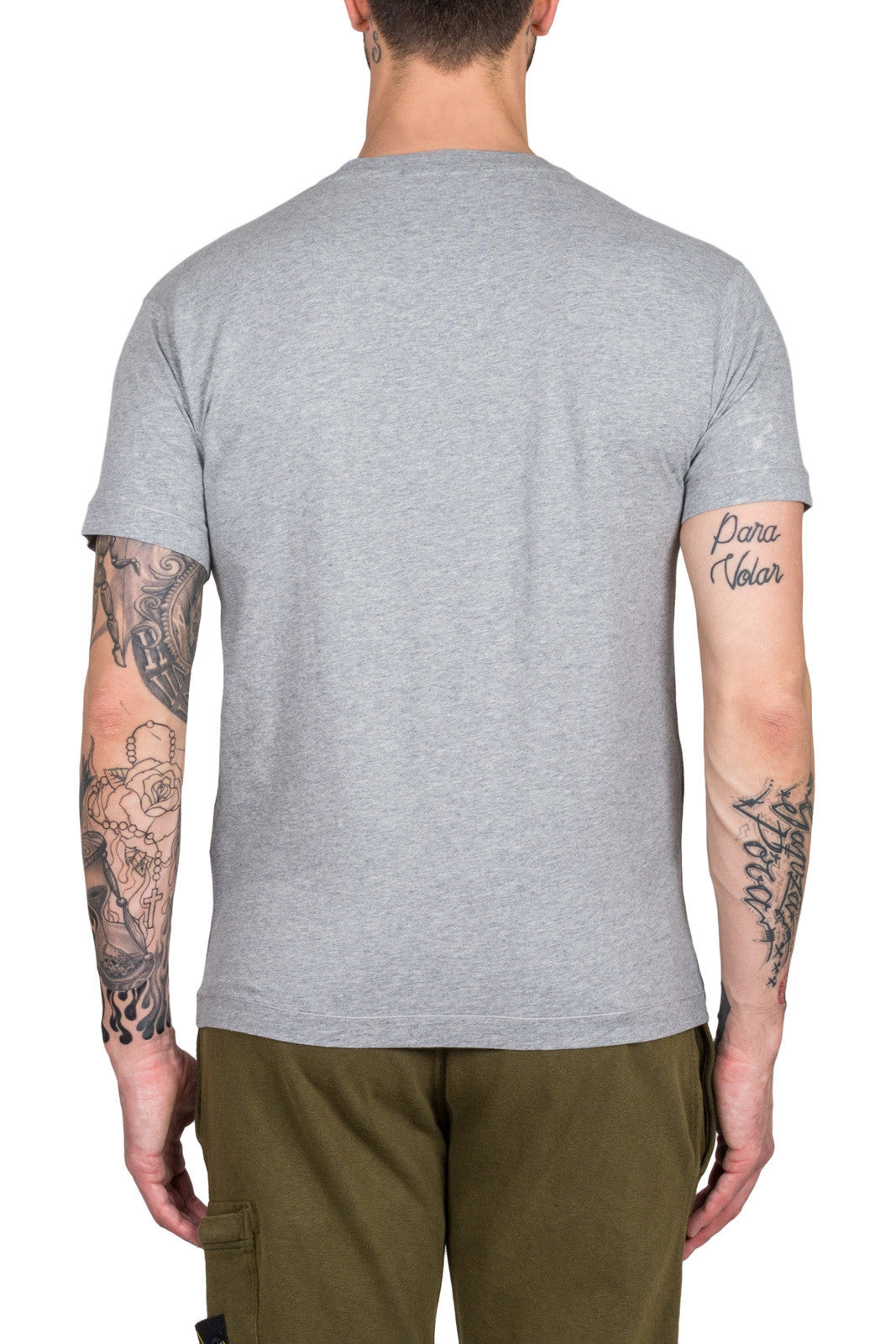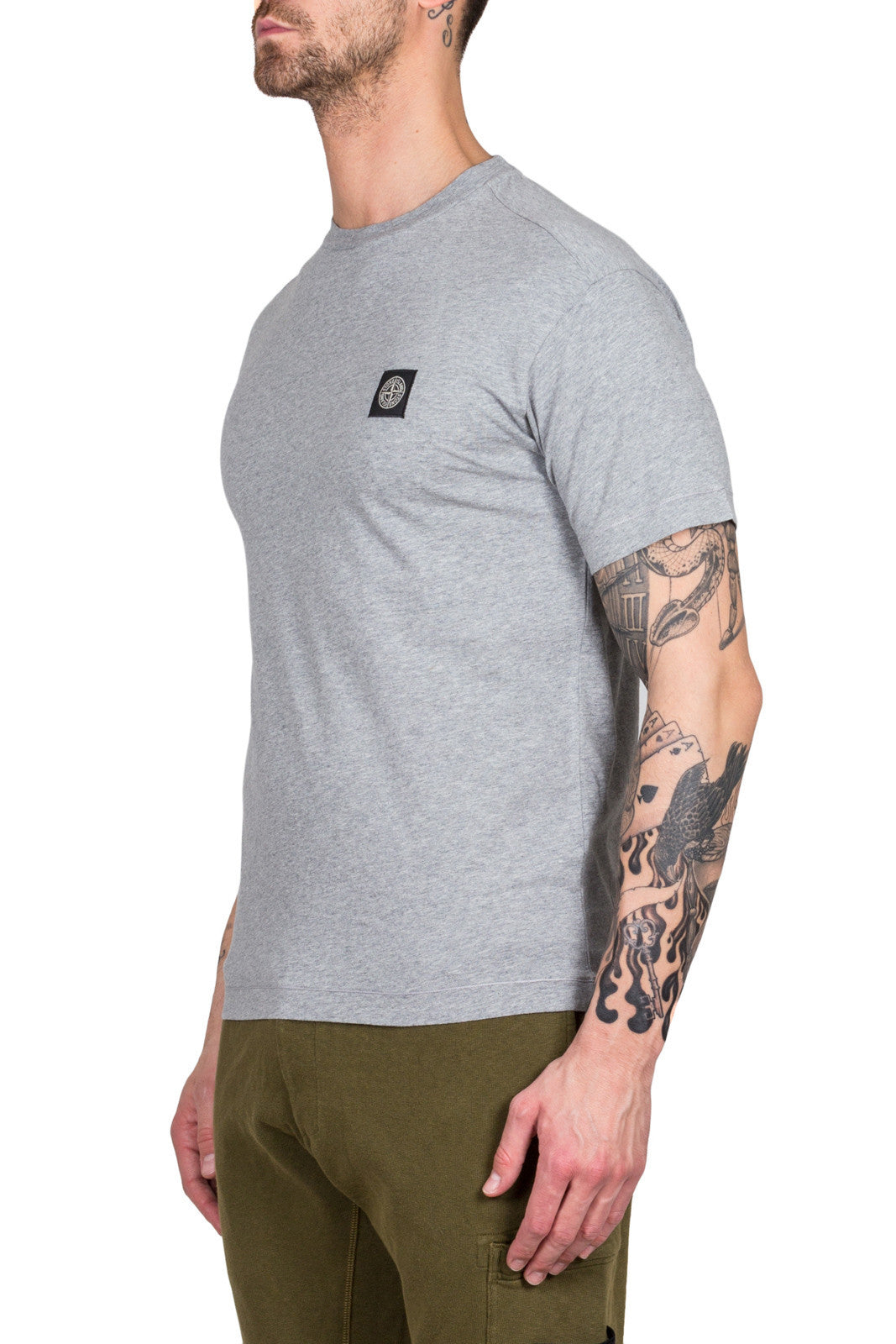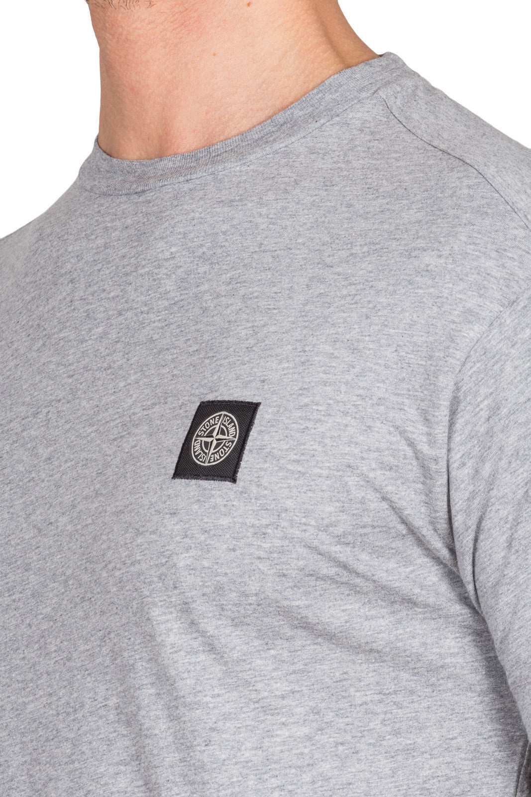 Short sleeve T-shirt in grey cotton jersey. Garment dyed. Ribbed neckline. Stone Island Compass logo patch on chest.