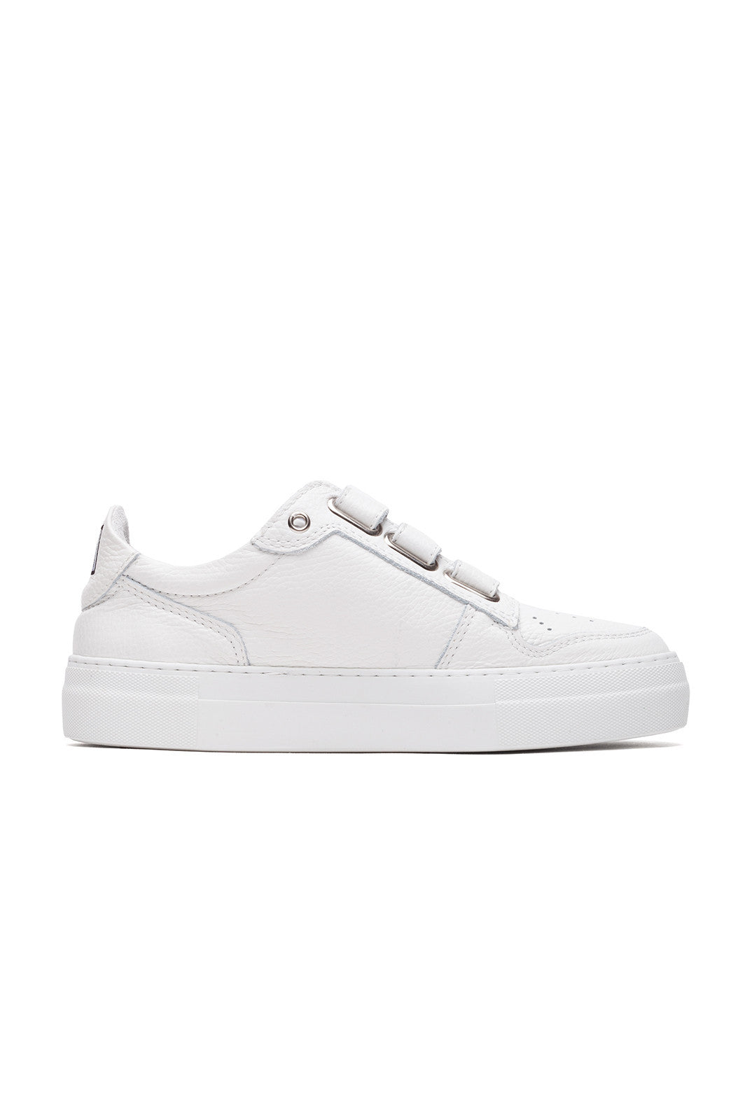Wite leather 3 strap sneakers. They feature a round toe, three hook and loop strap fastenings, an embroidered logo at the rear and a white rubber sole