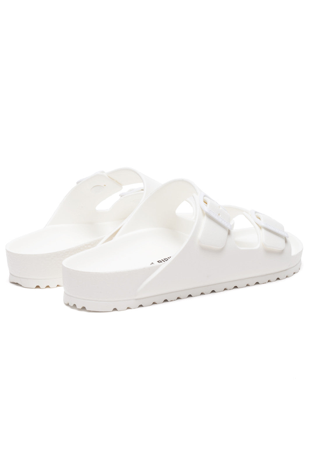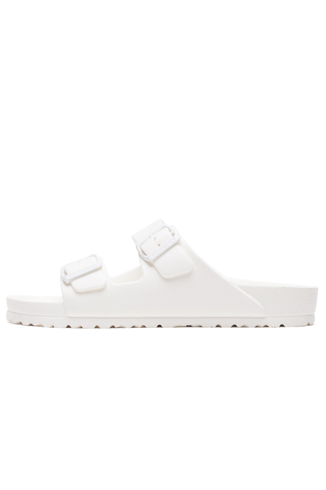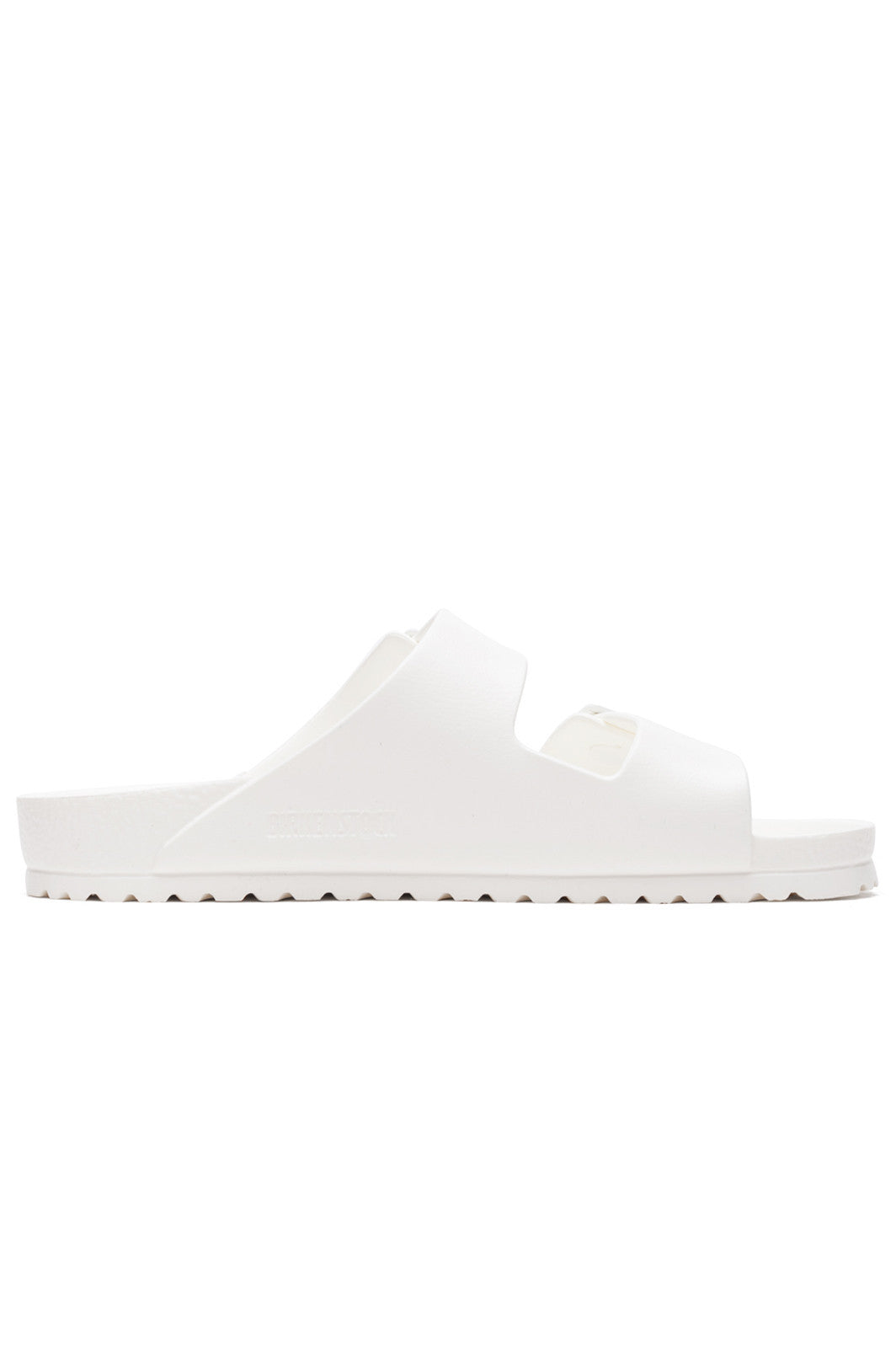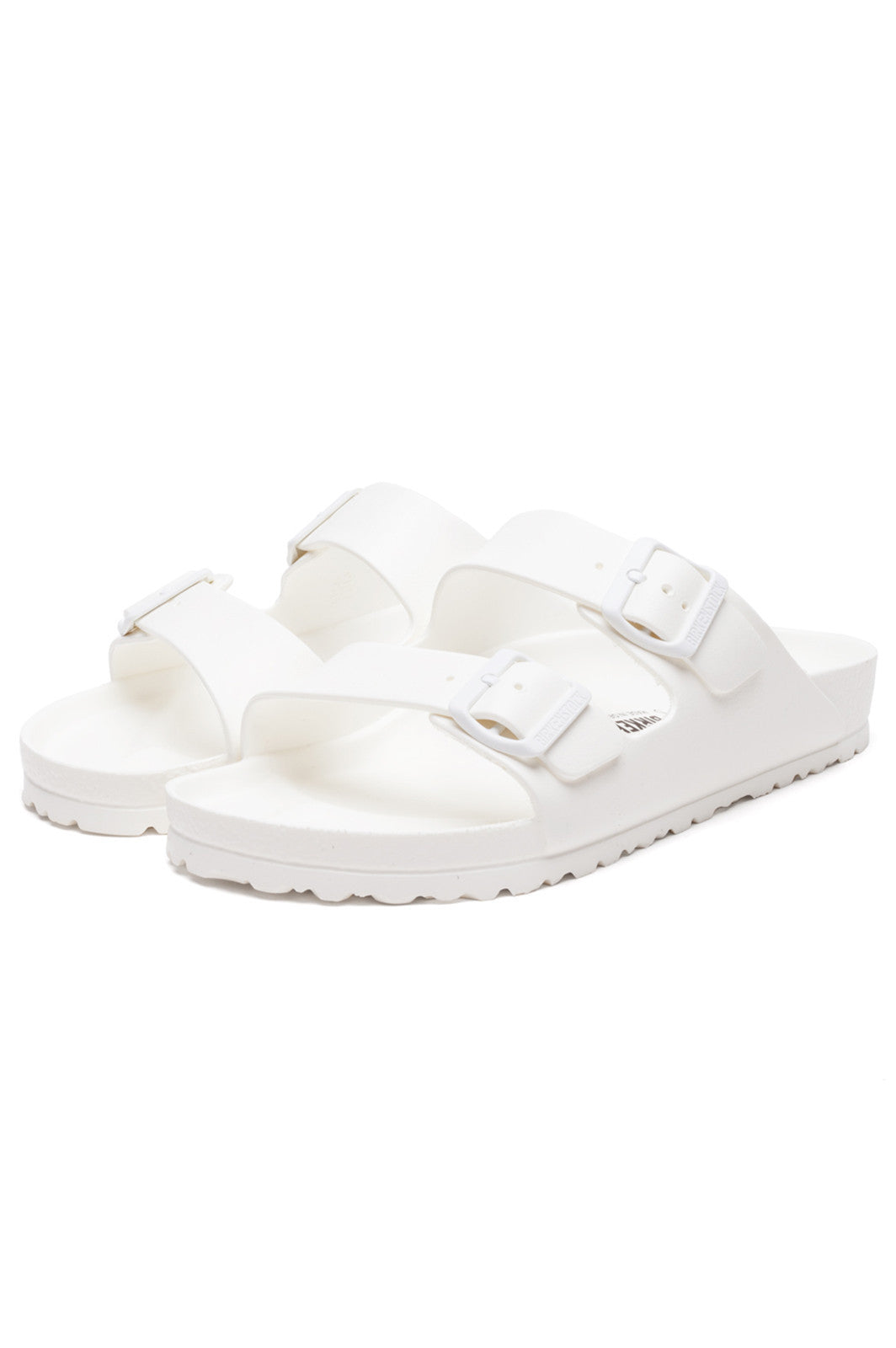 These white Birkenstock Arizona sandals are Made from EVA making them lightweight and waterproof. They feature a moulded footbed which follows the curve of the foot perfectly, there is also an added support for the arch and a heel cup for maximum comfort. The double straps can be adjusted with the buckle fastening, allowing even more flexibility. Effortless to wear and durable, these regular fit sandals are ideal for beach and leisure wear and will take you every step of the way through the summer. Please note due to the nature of the EVA material properties and the result of the moulding process, slight variations in sizing may occur.