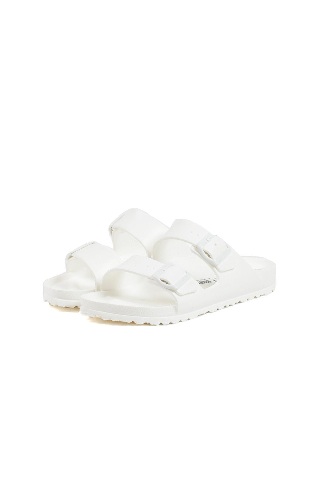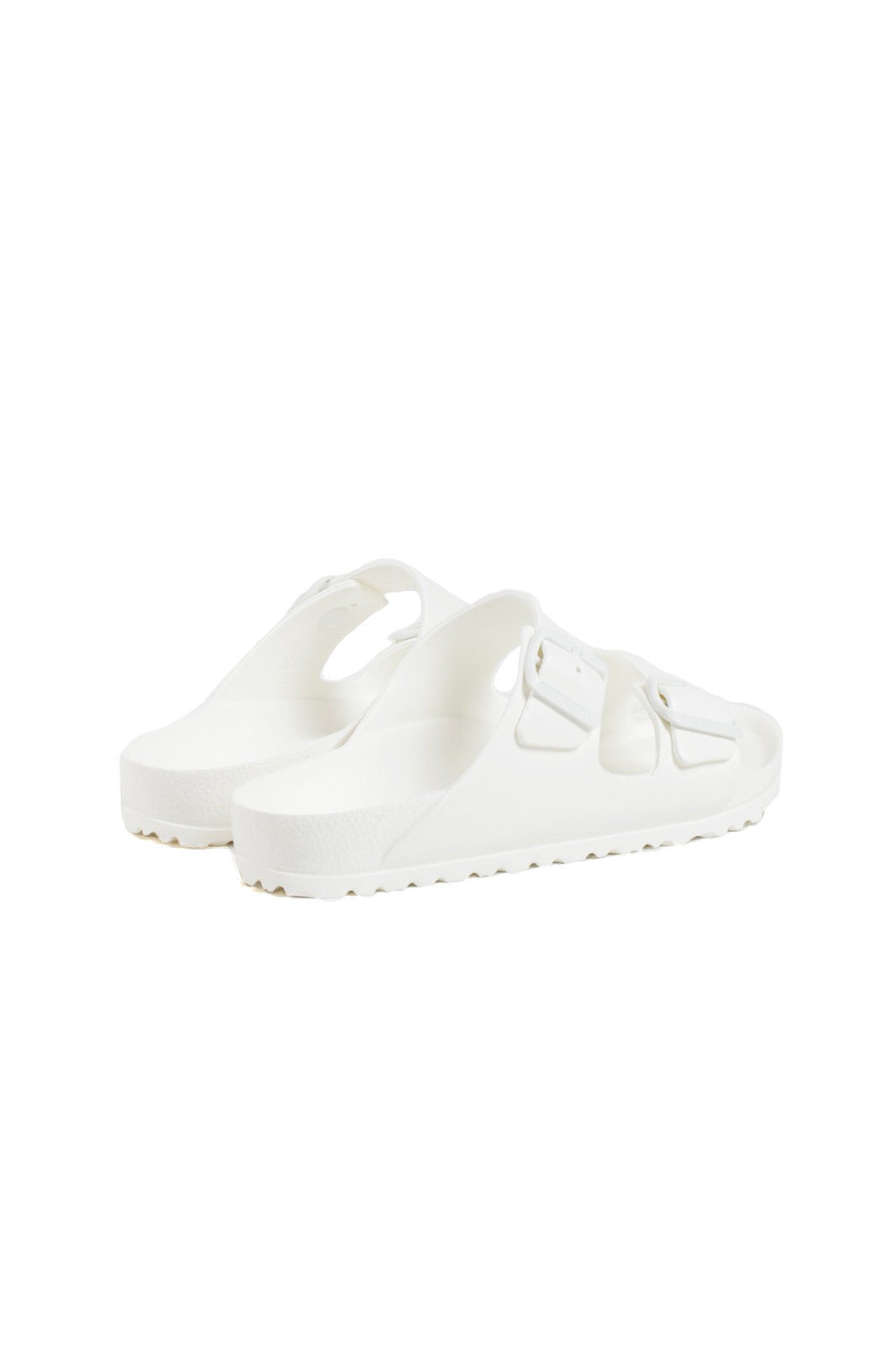 These white Birkenstock Arizona double strap sandals are ideal for leisure wear. Made from Eva, they are lightweight, waterproof and durable and therefore the perfect summer sandal for the beach. They feature a contoured, moulded footbed which seamlessly fits to the shape of the foot.There is also arch support and a heel cup for maximum comfort. The buckle fastening makes the two straps adjustable, allowing you to choose how much room your feet have whilst on the move. Plus, the matching white sole adds an extra touch of style. This model is a narrow fit. Please note due to the nature of the EVA material properties and the result of the moulding process, slight variations in sizing may occur. Please note due to the nature of the EVA material properties and the result of the moulding process, slight variations in sizing may occur.