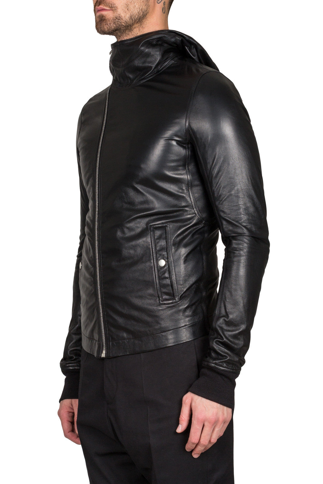 Rick Owens SS17 Walrus Bullet jacket in black ram leather has an asymmetrii ziper, two single-button side pockets, ribbed cuffs, a small funnel collar and a hood.