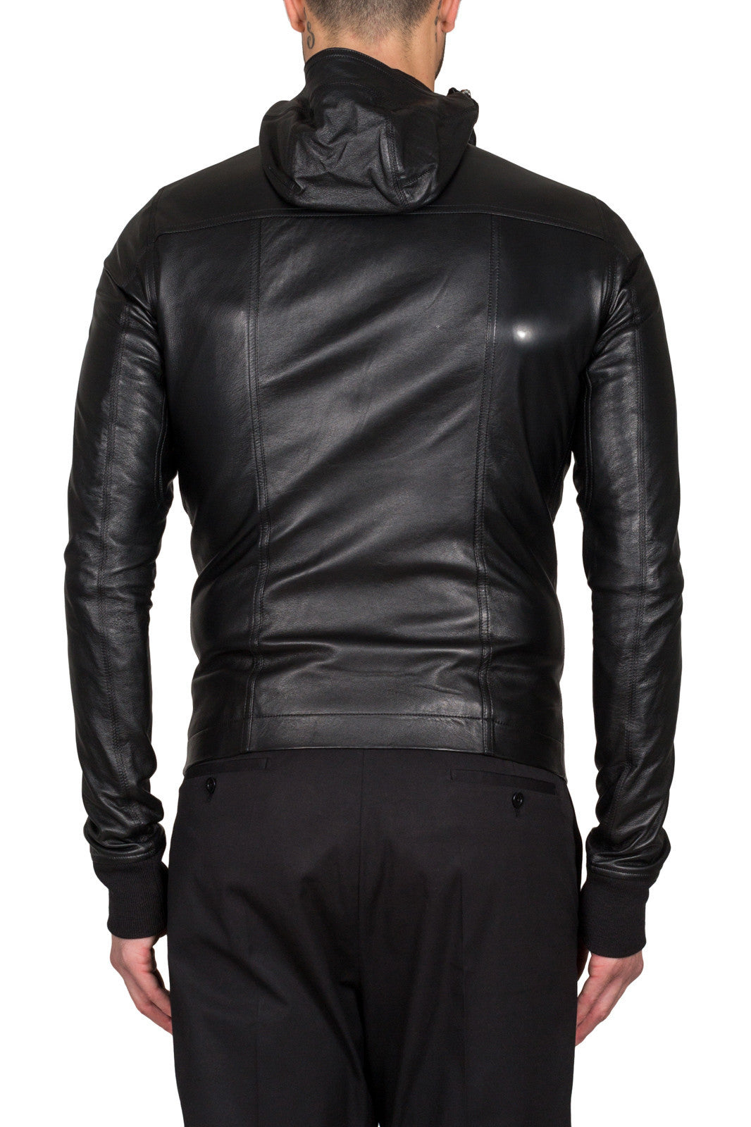 Black RU17S9766 LVT 09Rick Owens SS17 Walrus Bullet jacket in black ram leather has an asymmetrii ziper, two single-button side pockets, ribbed cuffs, a small funnel collar and a hood.