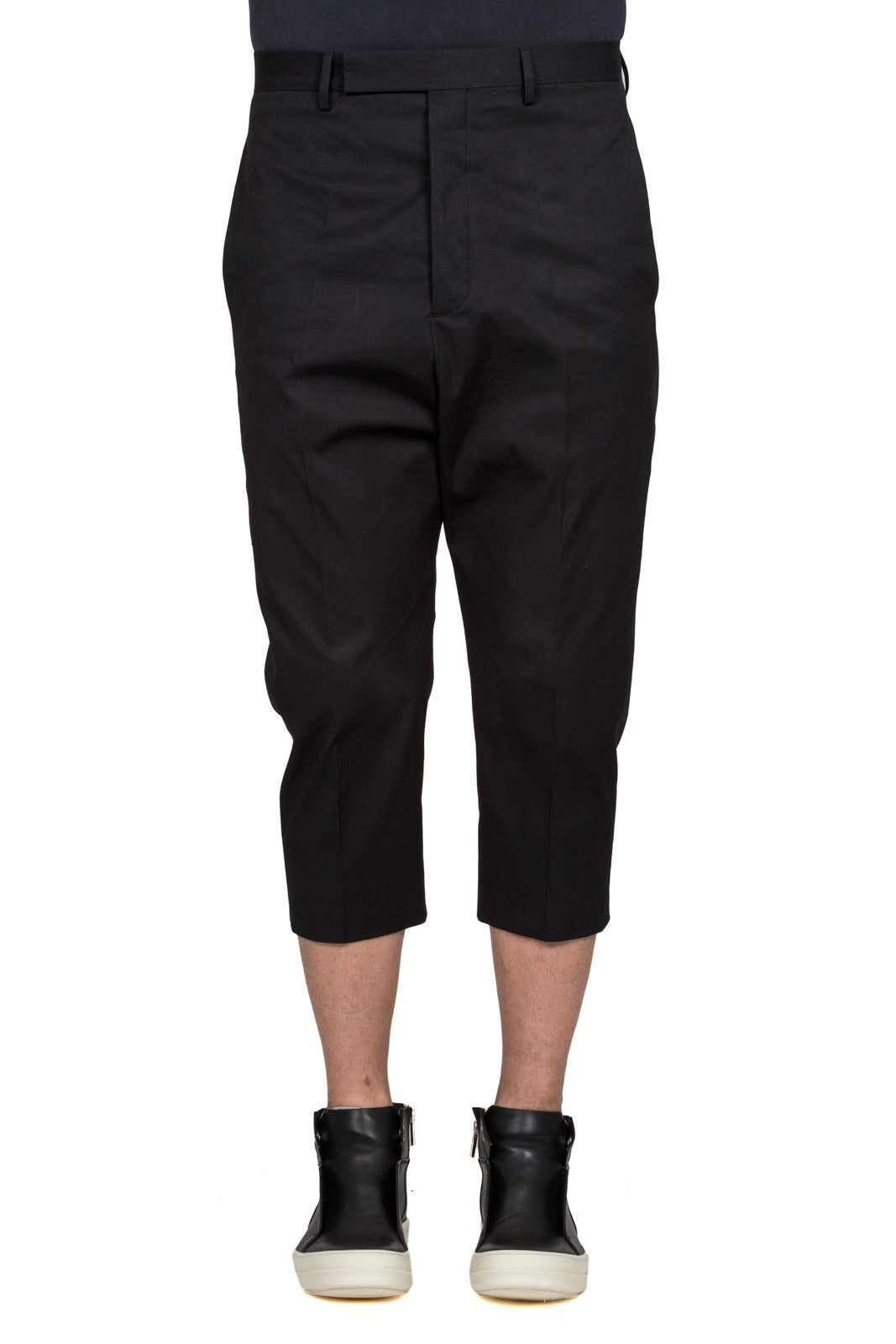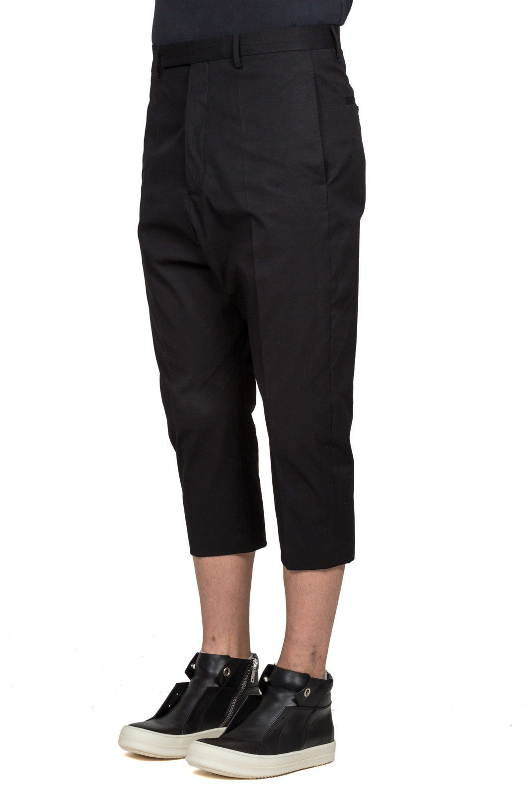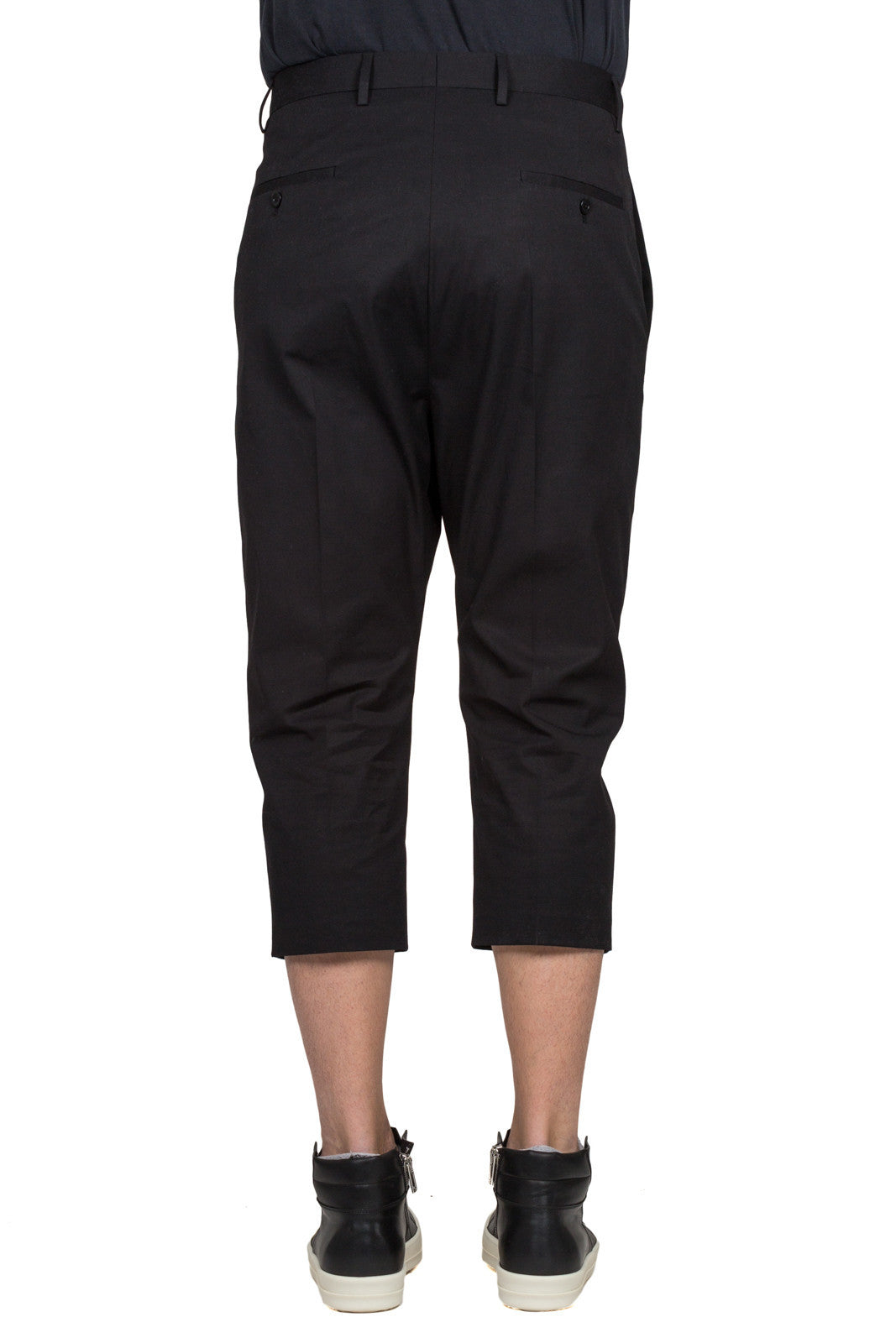 Black RU17S9359 TE 09Rick Owens SS17 Walrus cropped astaires in black have a midi-lenght, a drop crotch, a concealed off-center button closure plus a concealed center button fastening, two back pockets with single-button closure and two side pockets.