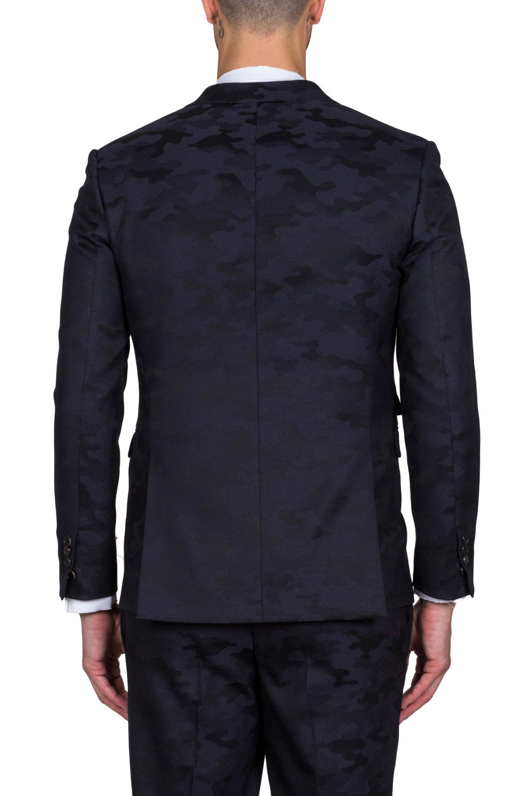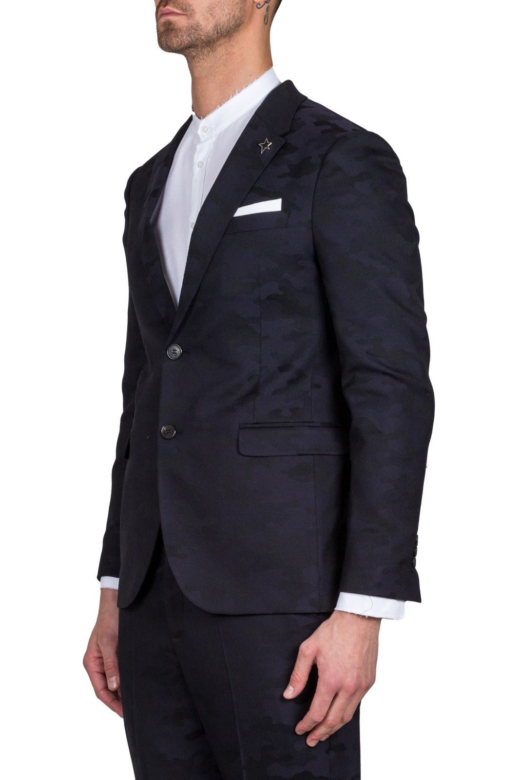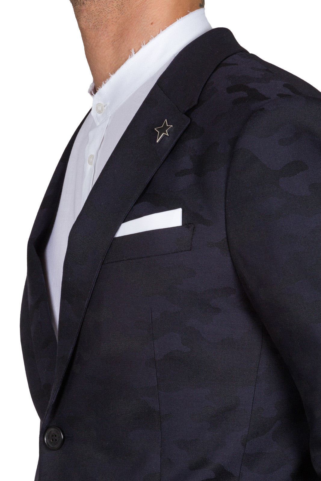 Navy PBGI256V E011 415Black stretch cotton camouflage print blazer featuring notched lapels, long sleeves, button cuffs, a front button fastening, front flap pockets, a double vent to the rear, a chest pocket, a white pocket square and a star pin from Neil Barrett.