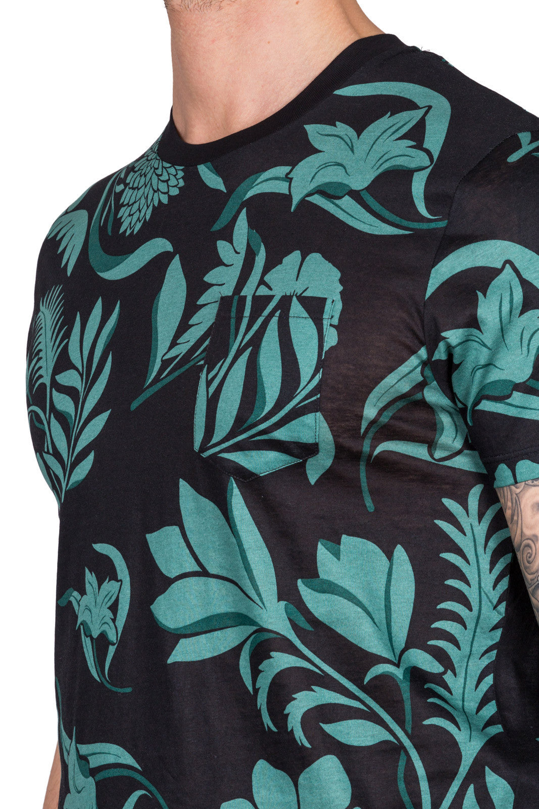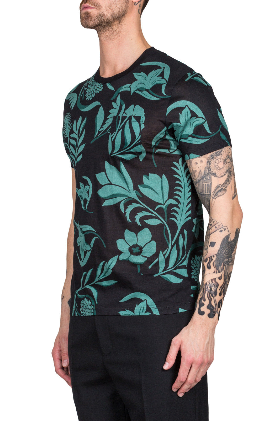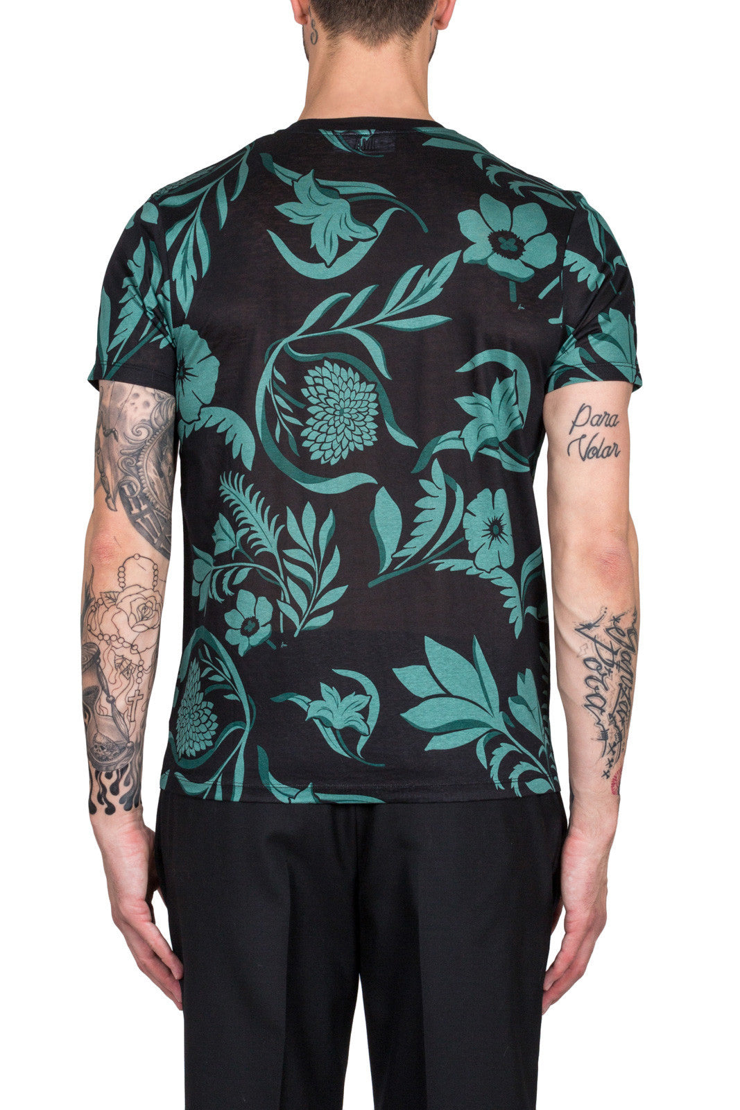 Black cotton crew neck T-shirt. It features short sleeves and an all-over green floral print.