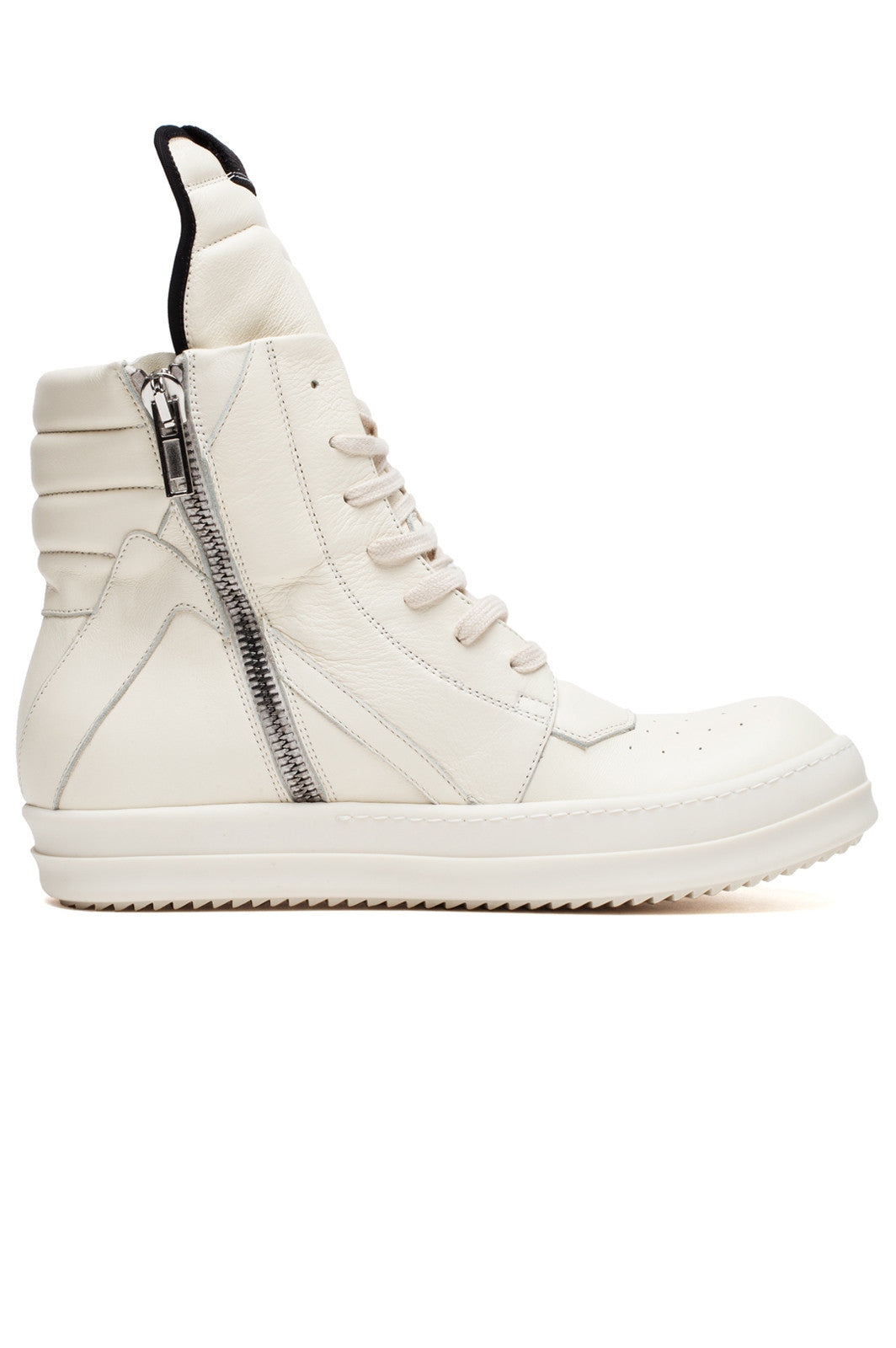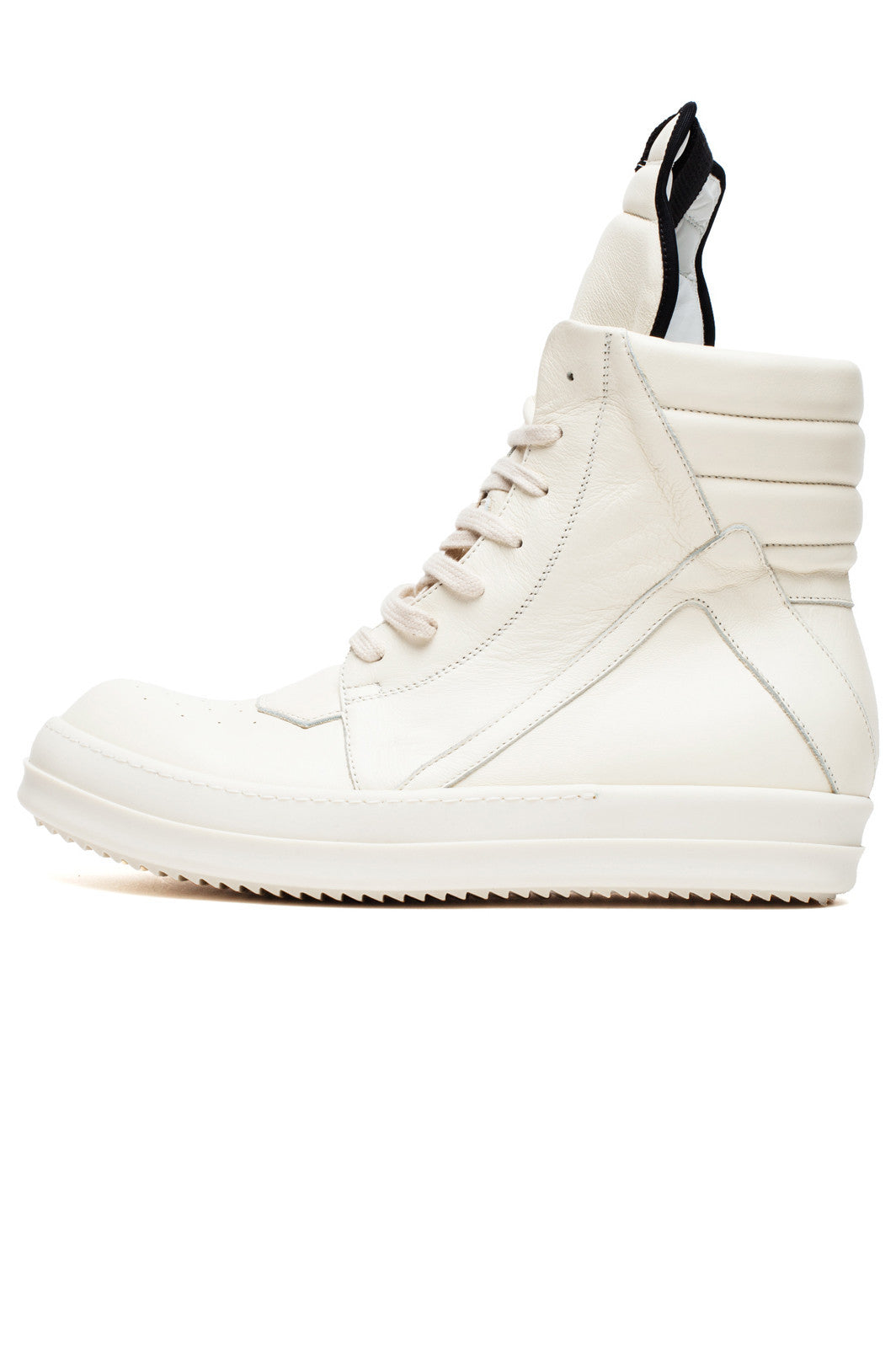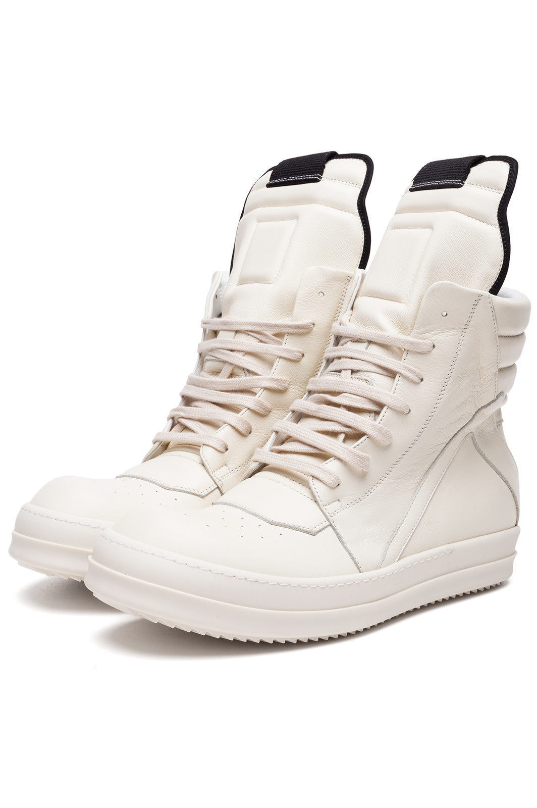 Rick Owens SS17 Walrus Geobasket in milk white leather feature laces, a side zipper for easy fastening and a white rubber shark-tooth sole.
