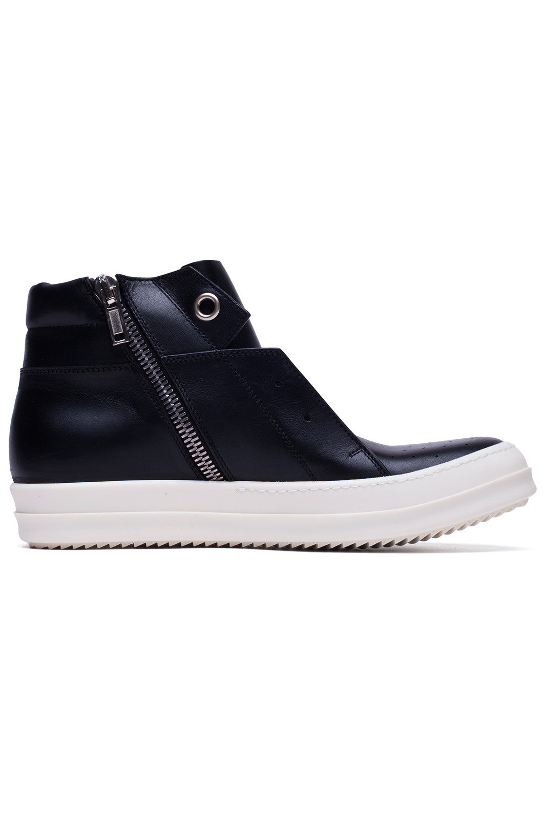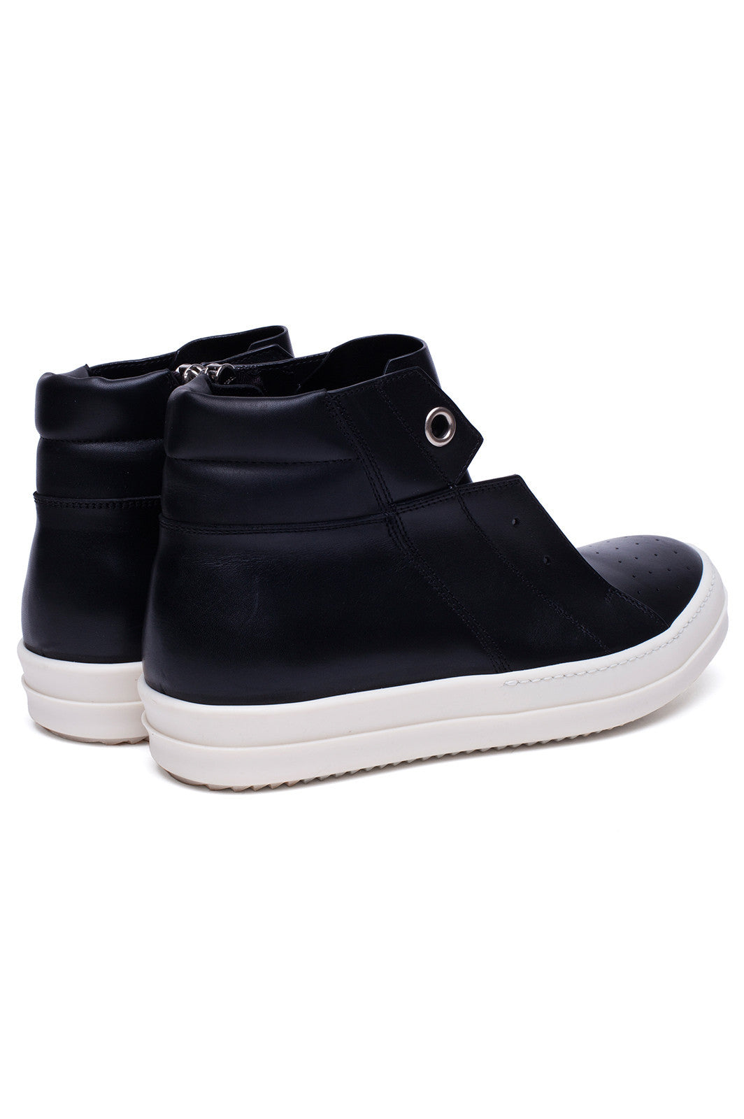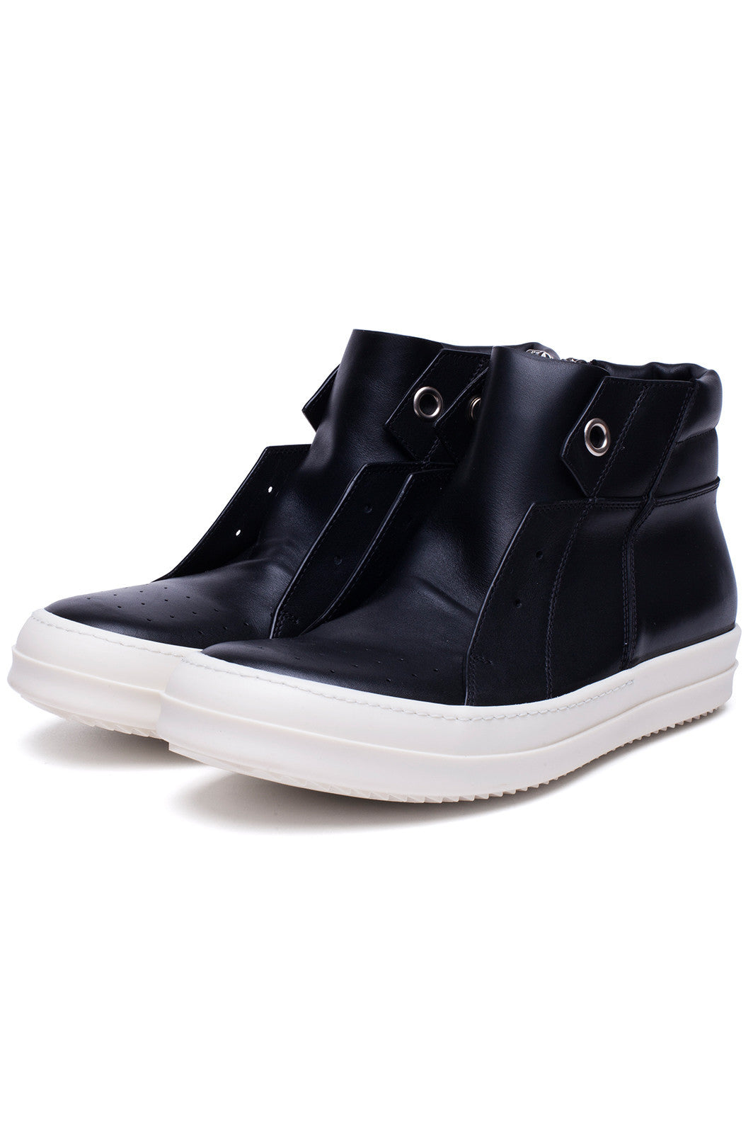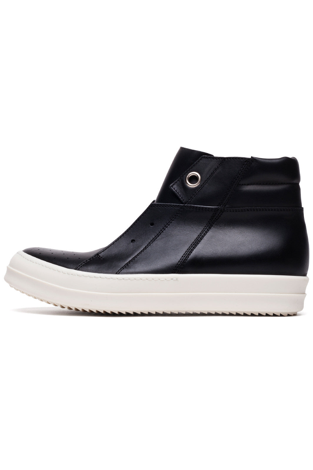 Rick Owens SS17 Walrus Island Dunk pull-on shoes in blak leather are laceless with two large eyelet details at the top hle details in front and white rubber shark-tooth soles.