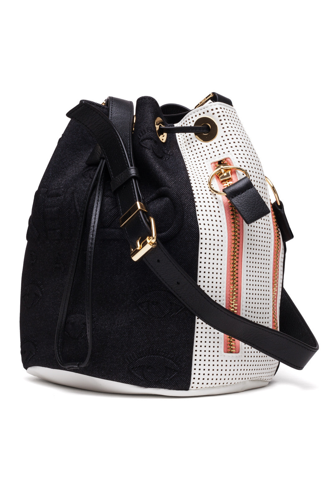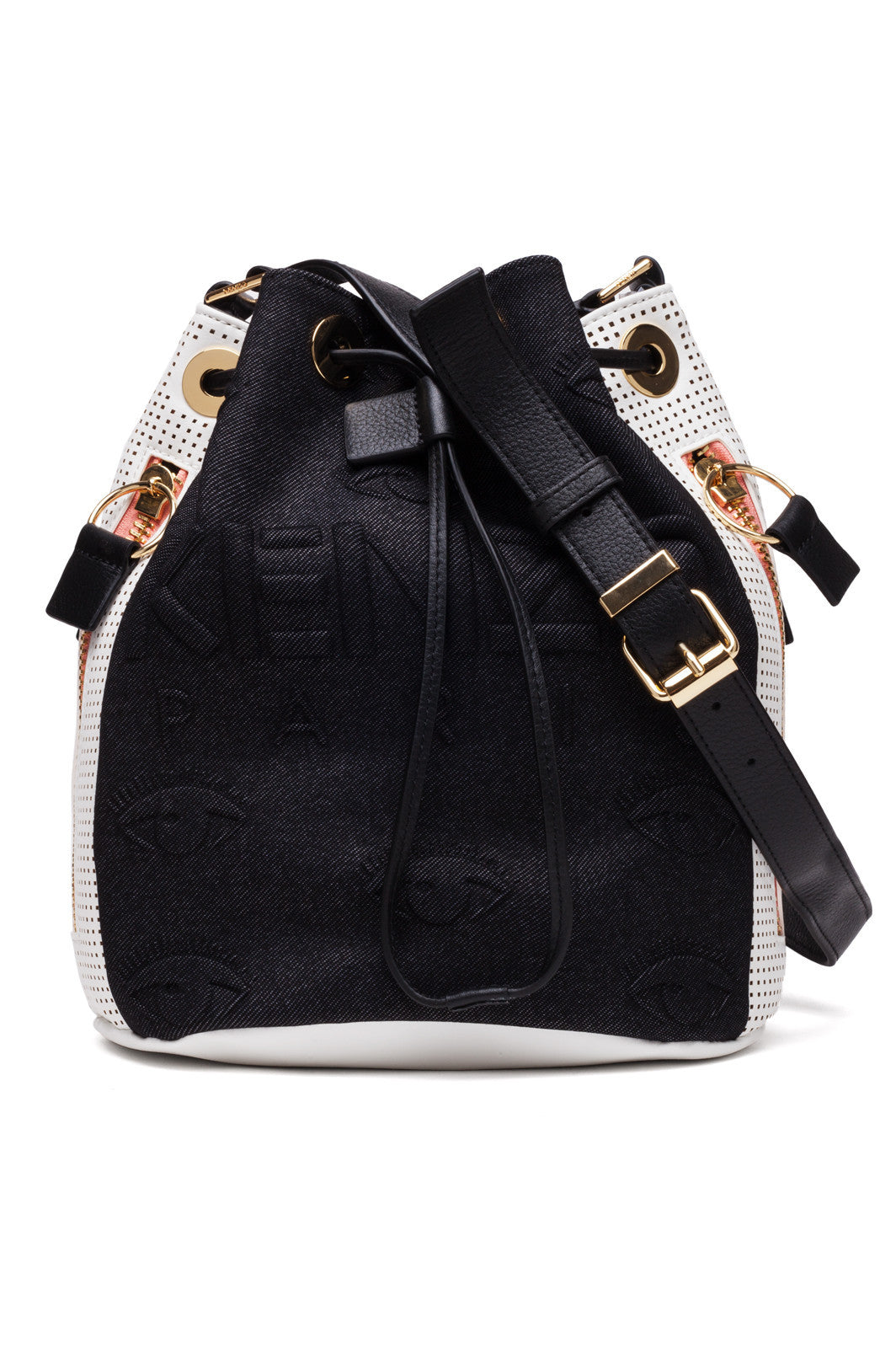 Black F752SA401F09 99Black and white leather 'Kombo' bucket tote featuring a drawstring fastening, a detachable and adjustable shoulder strap, gold-tone hardware, a back zip pocket, an internal patch pocket, a removable and adjustable top handle and side zip pockets from Kenzo.