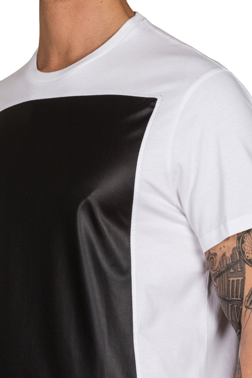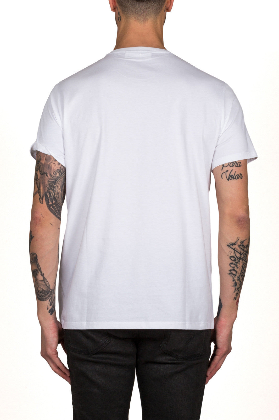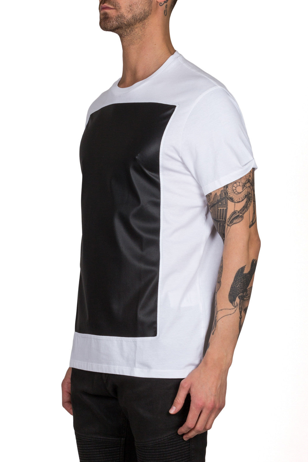 White cotton square detail t-shirt featuring a round neck, short sleeves and a black square patch from Neil Barrett.