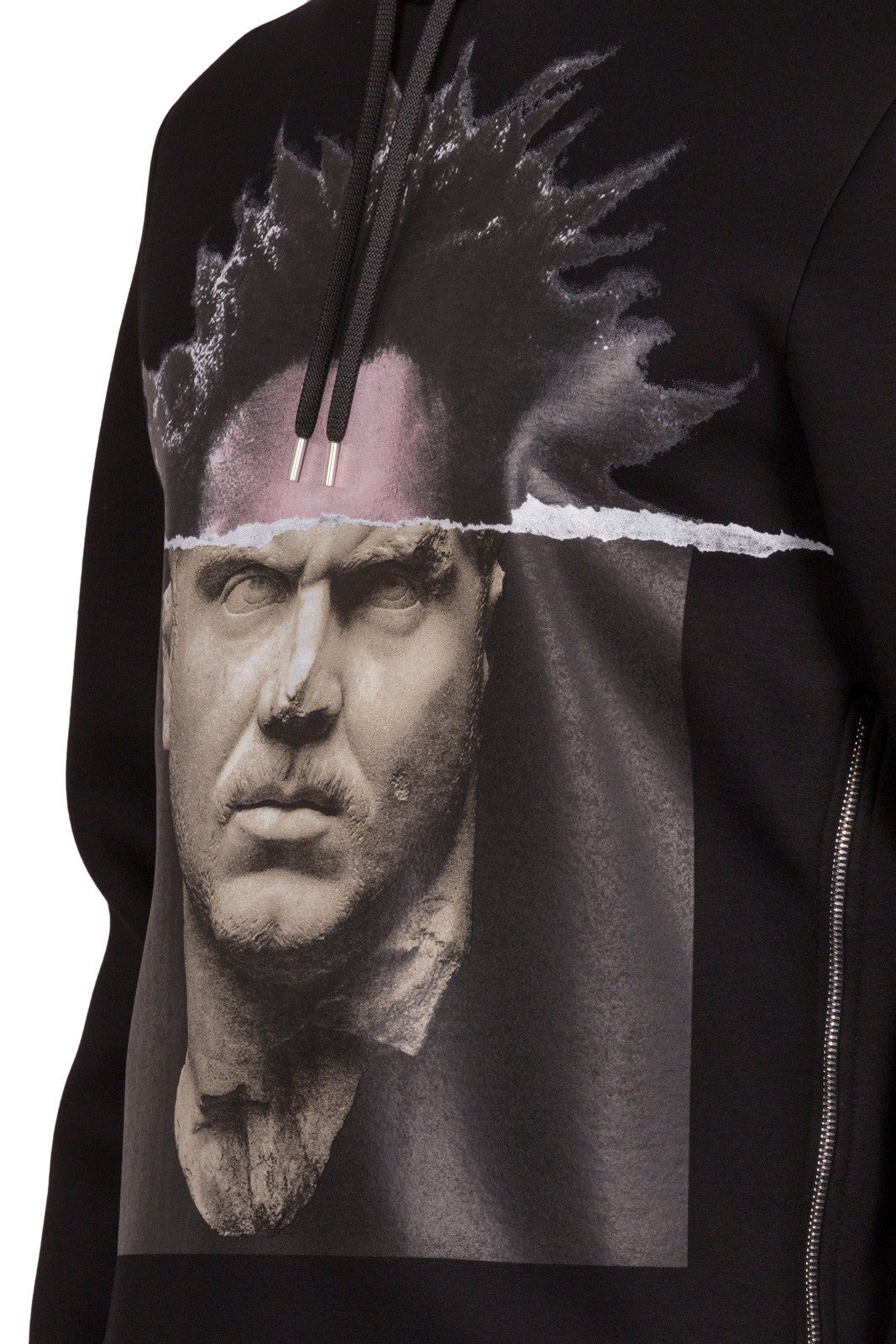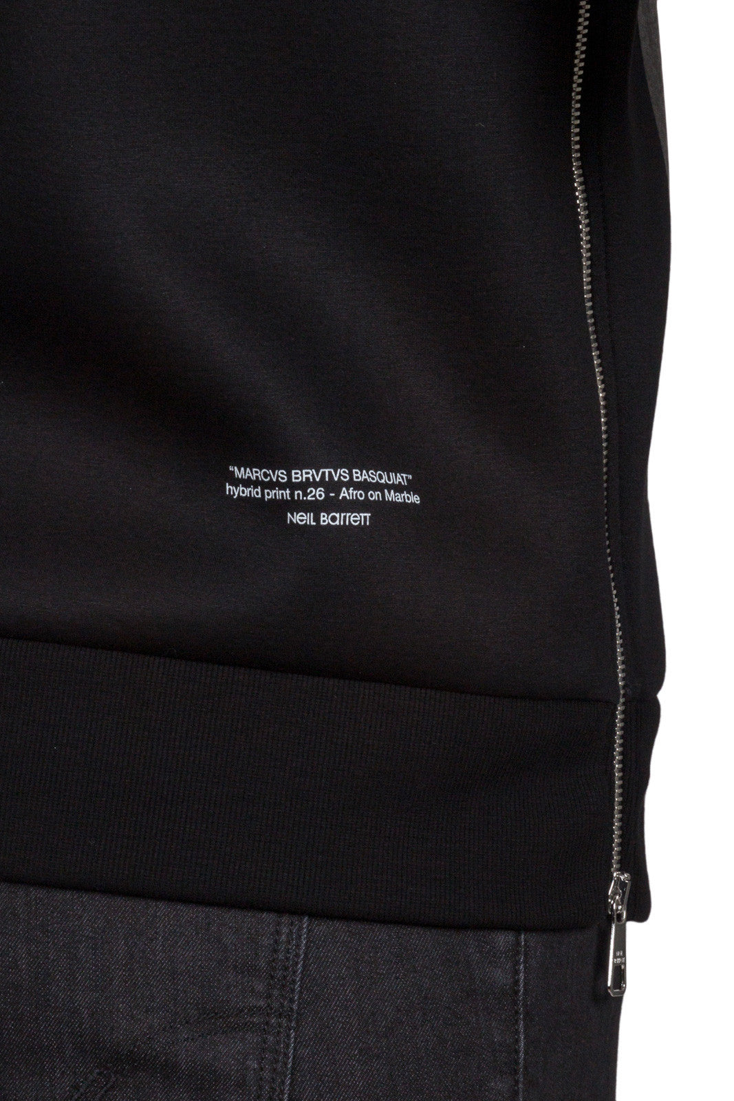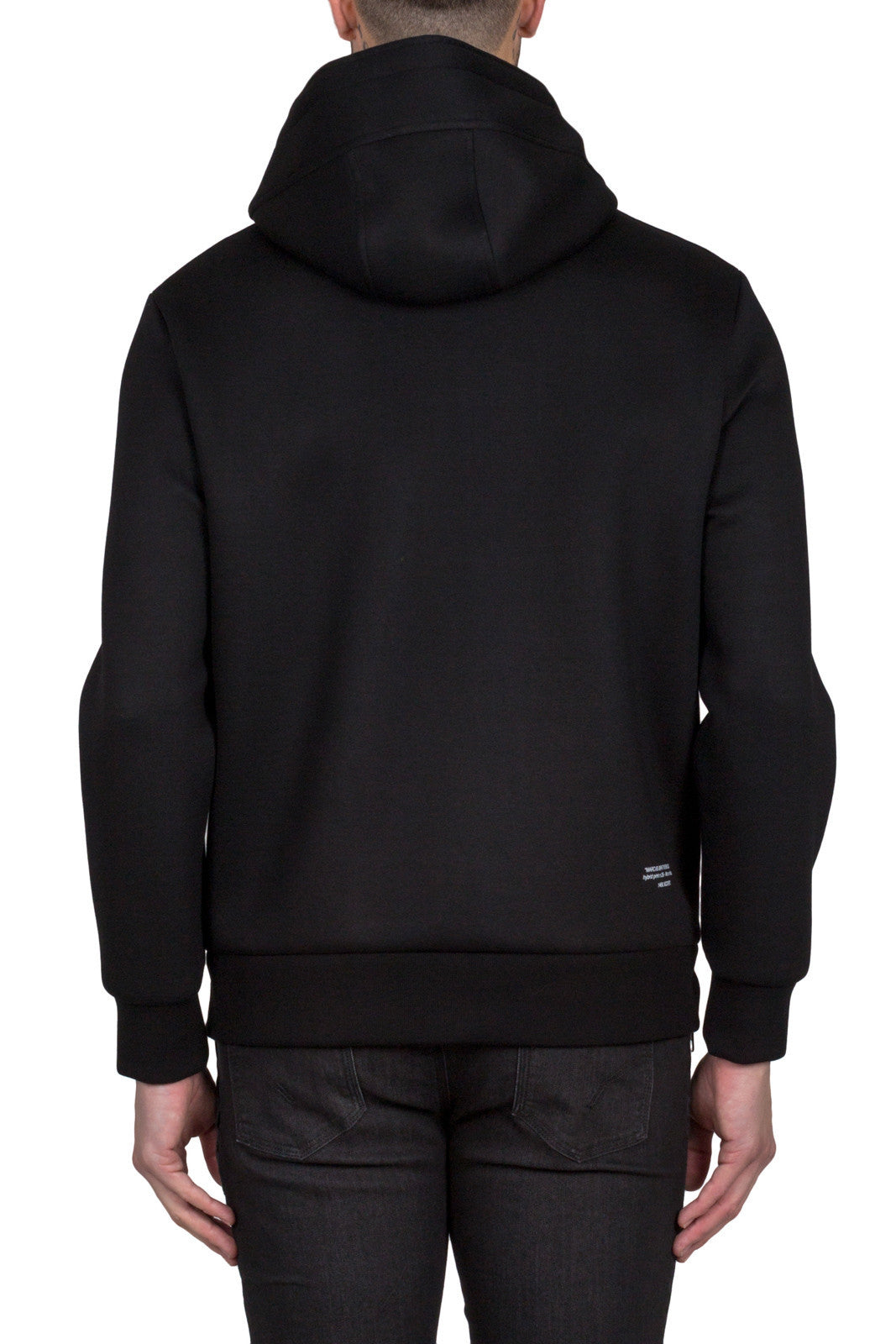Black PBJS188D E528S 01Black modernist blocking hooded sweatshirt featuring a drawstring hood, long sleeves and side zip details from Neil Barrett.