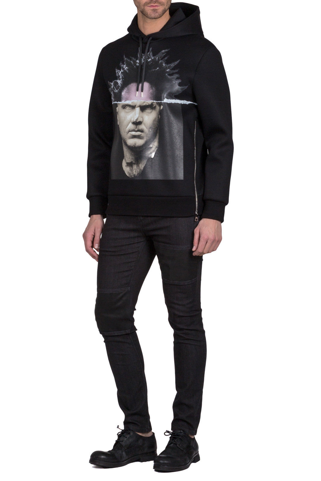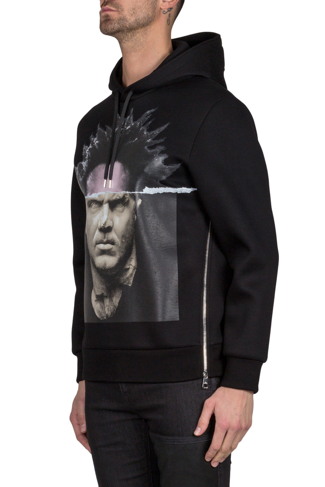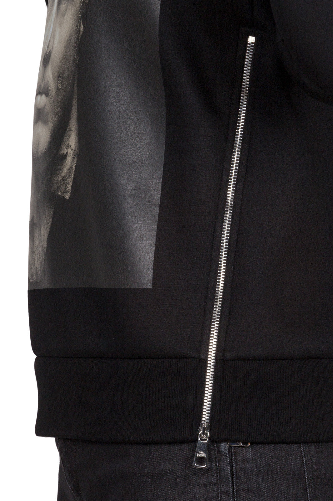 Black PBJS188D E528S 01Black modernist blocking hooded sweatshirt featuring a drawstring hood, long sleeves and side zip details from Neil Barrett.