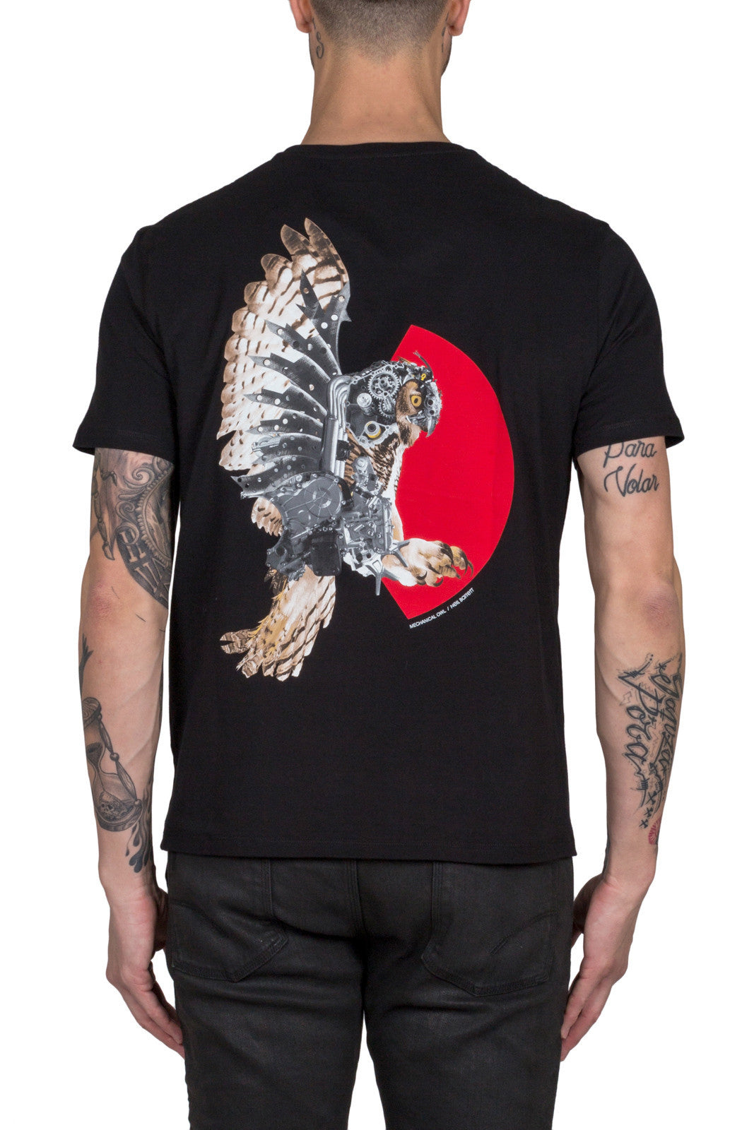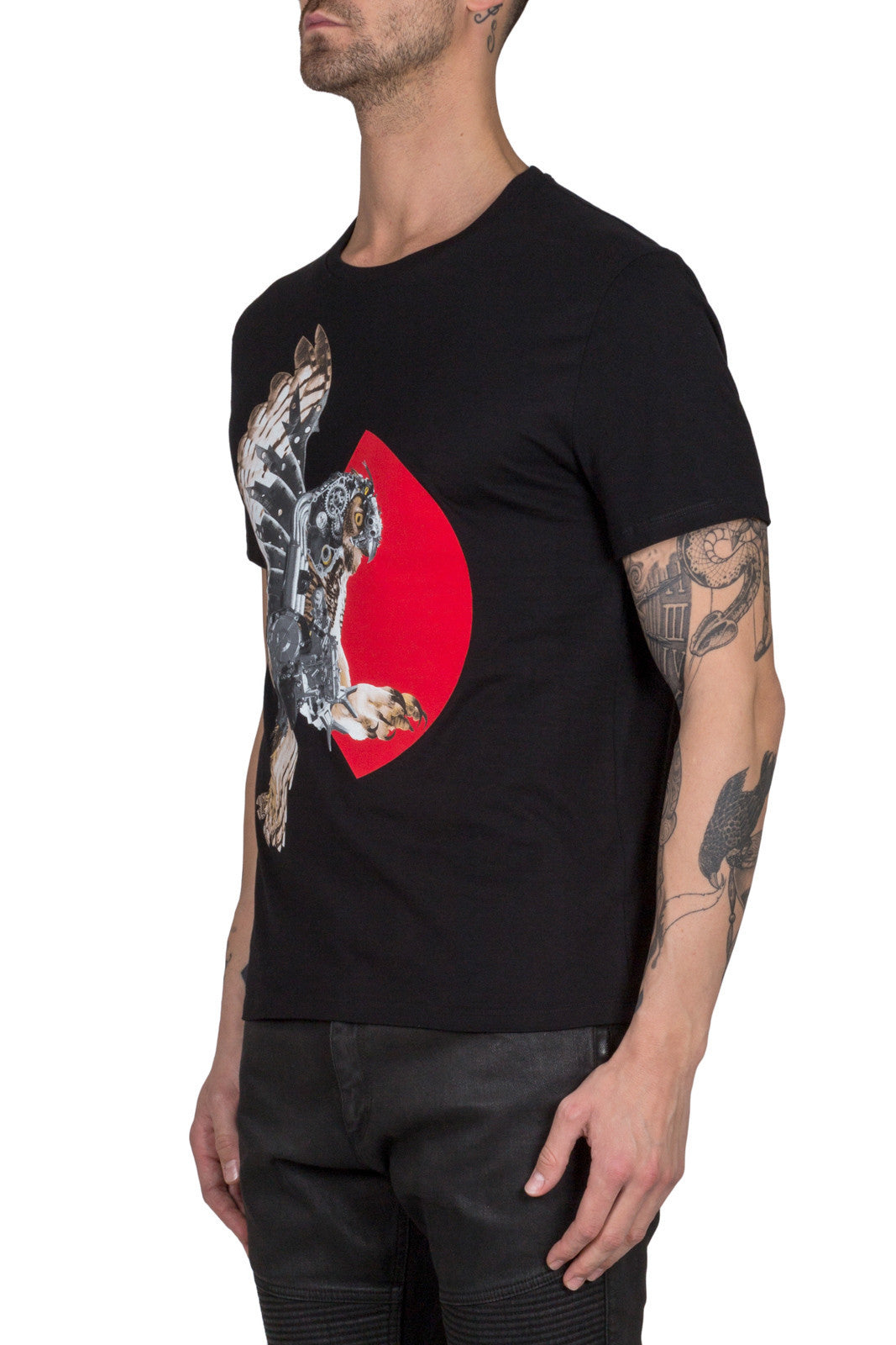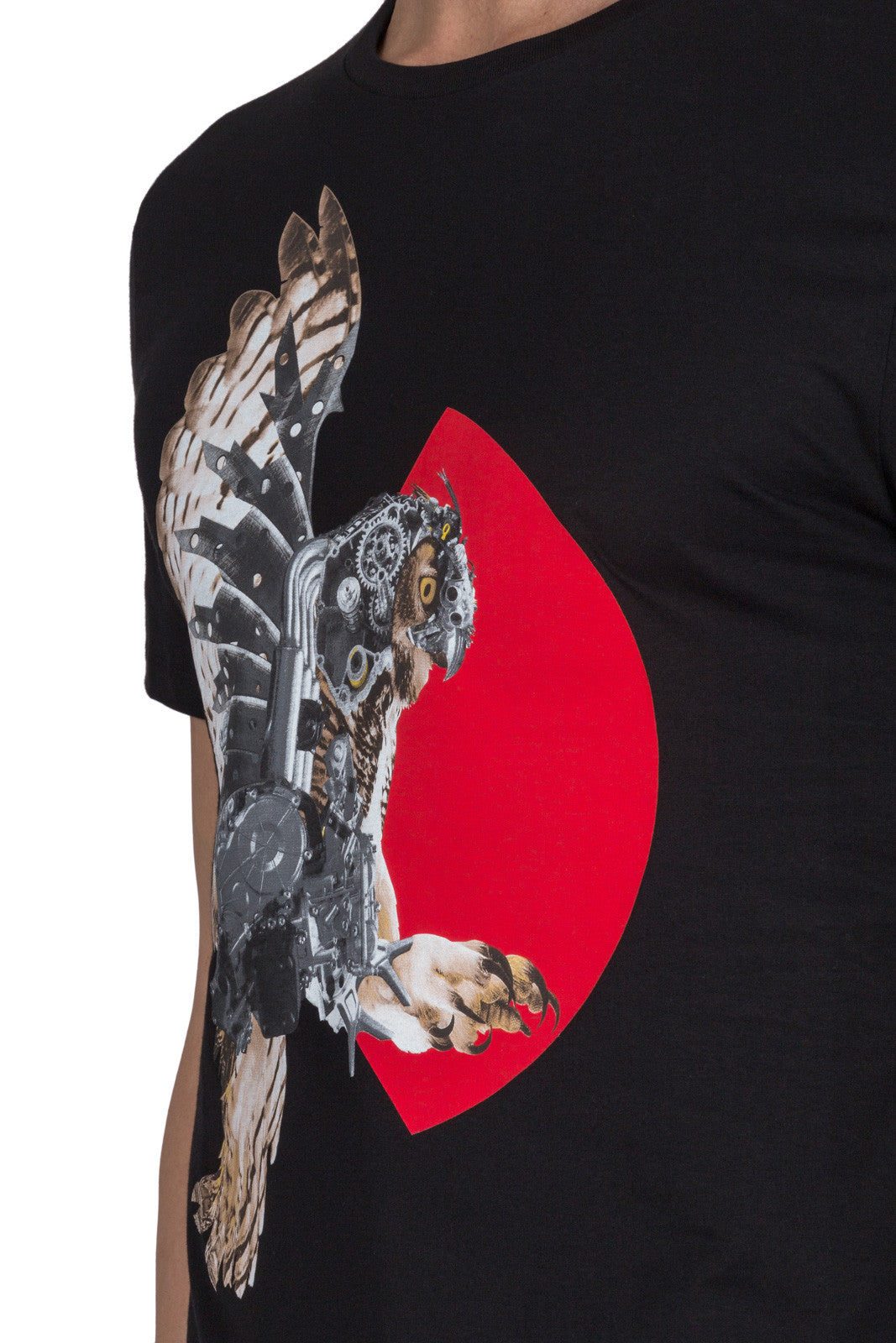 Black PBJT185S E523S 1076Back and red cotton mechanical owl t-shirt featuring a round neck, short sleeves, a print to the front, a print to the rear and a straight hem from Neil Barrett.