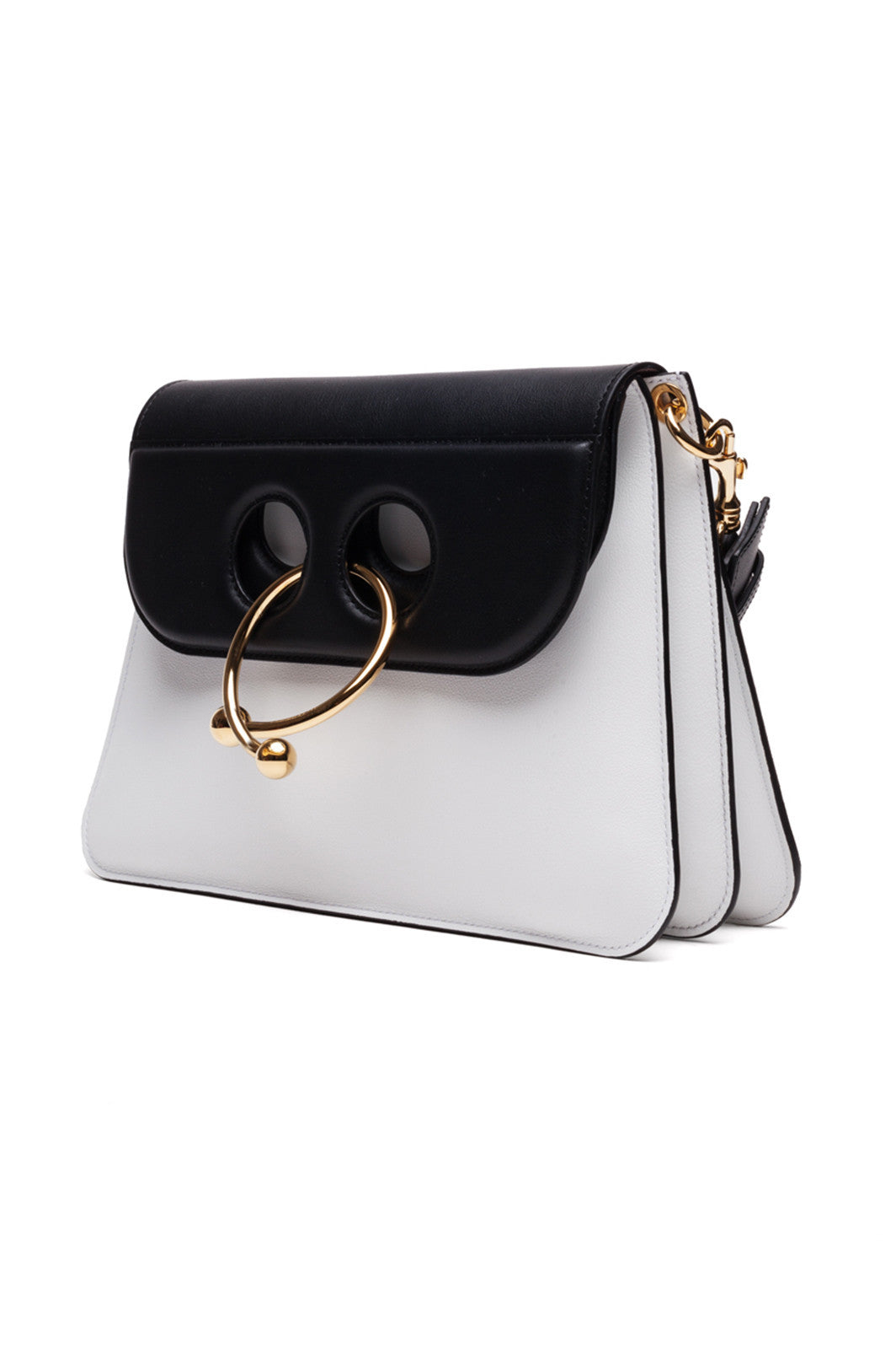 White HB02JWA 404 001A calf leather bag with three compartments and a front flap, that fastens with a gold-tone circular barbell piercing closure. Luxurious with a youthful twist, this bag has a calf leather interior for extra softness.