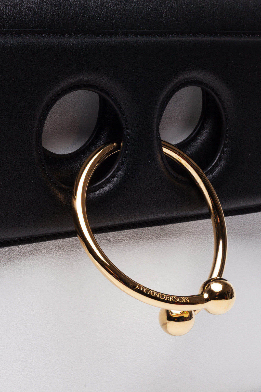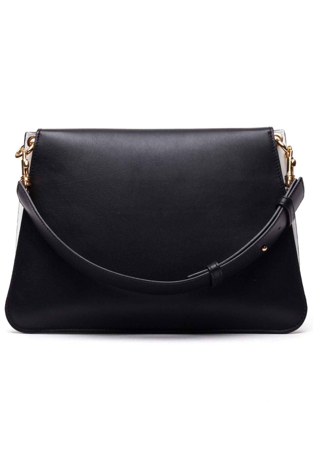 A calf leather bag with three compartments and a front flap, that fastens with a gold-tone circular barbell piercing closure. Luxurious with a youthful twist, this bag has a calf leather interior for extra softness.