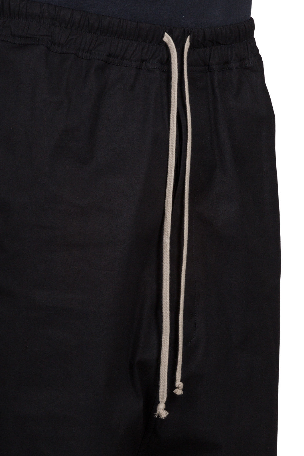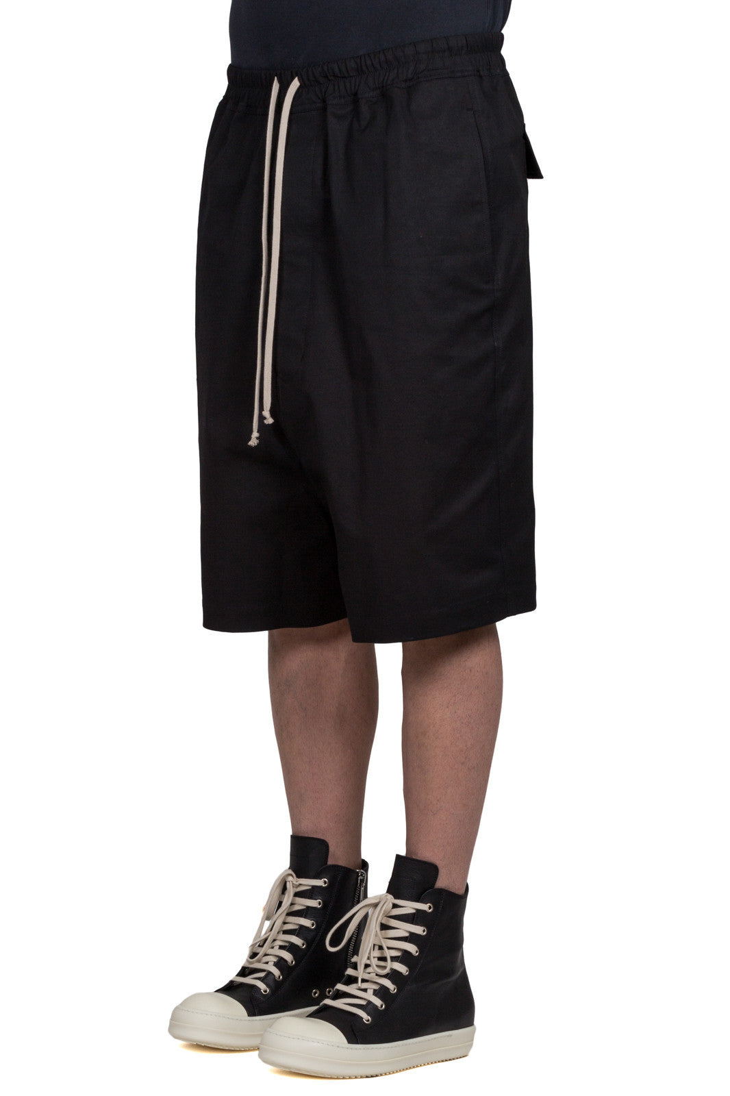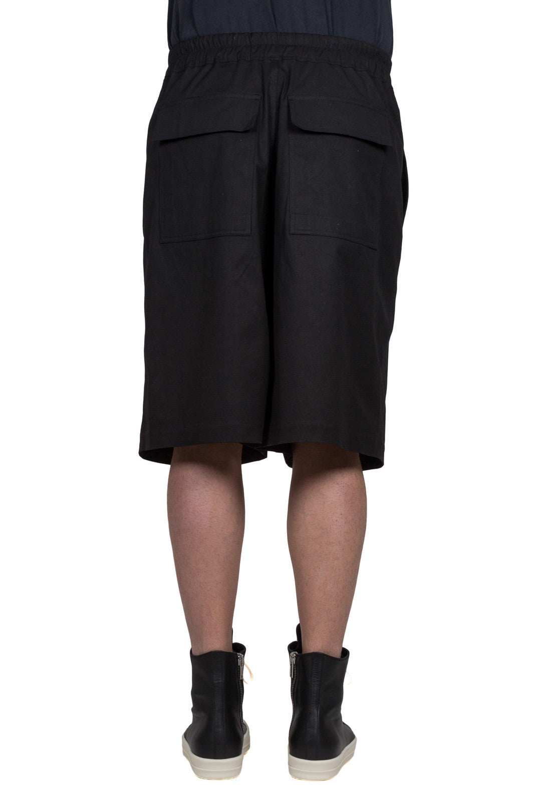 Black RU17S9382 TE 09Black cotton blend Mega shorts featuring an elasticated waistband with a drawstring fastening, side seam pockets, a knee length and rear flap pockets from Rick Owens.