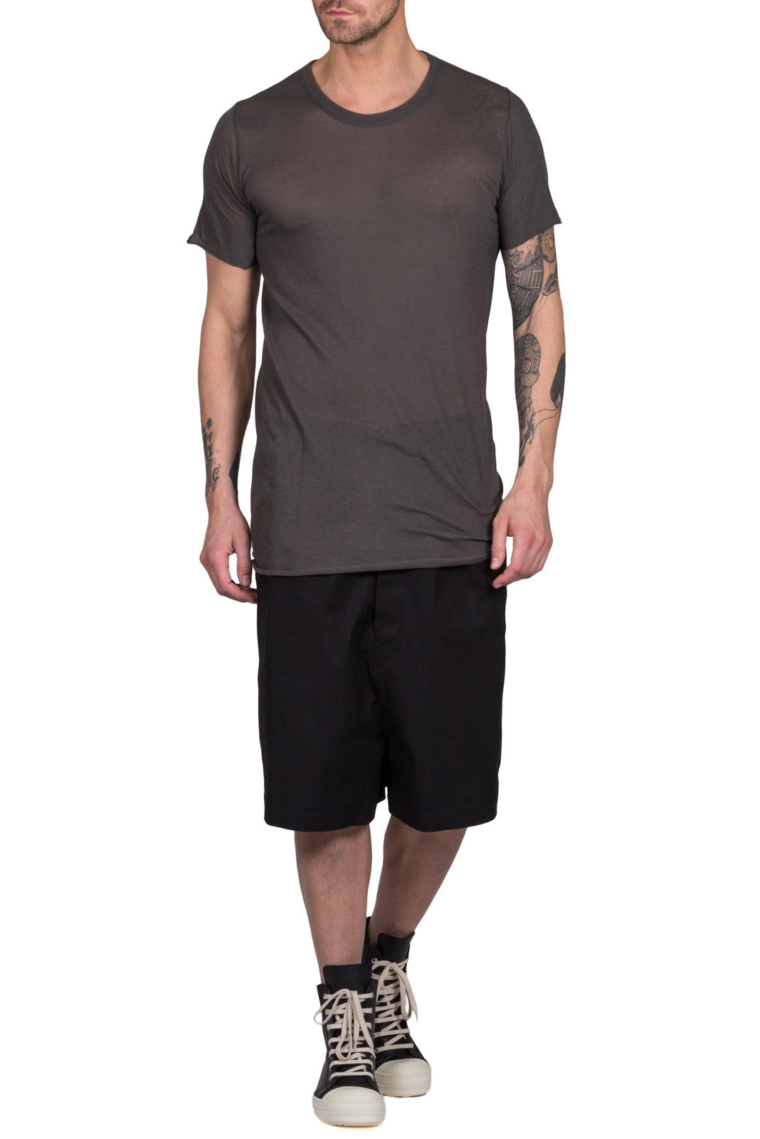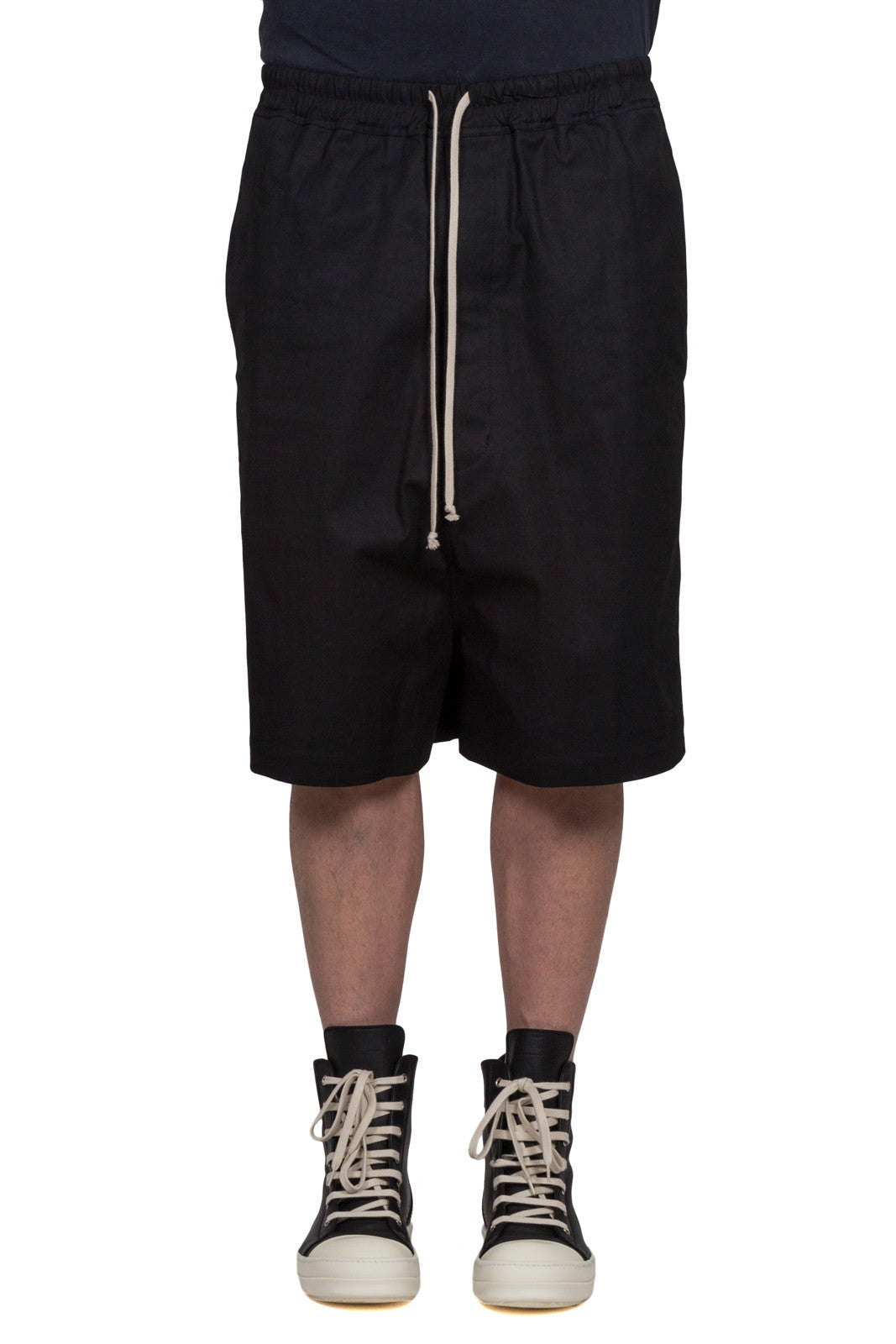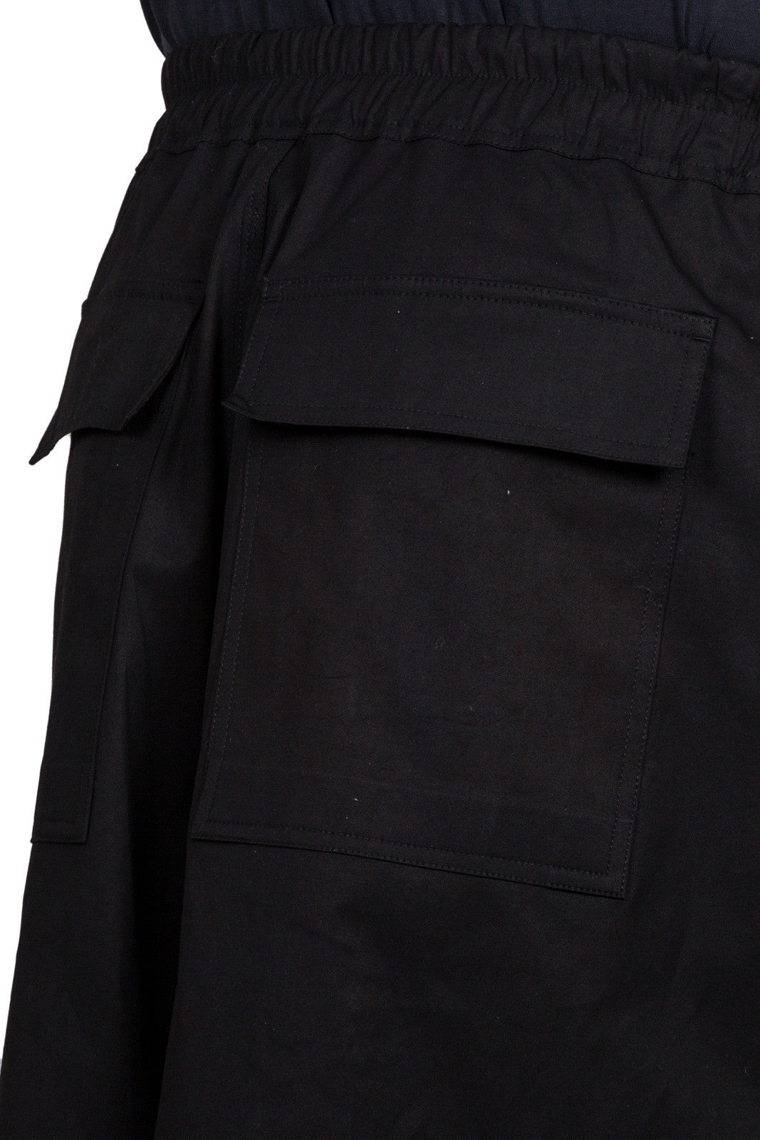 Black RU17S9382 TE 09Black cotton blend Mega shorts featuring an elasticated waistband with a drawstring fastening, side seam pockets, a knee length and rear flap pockets from Rick Owens.