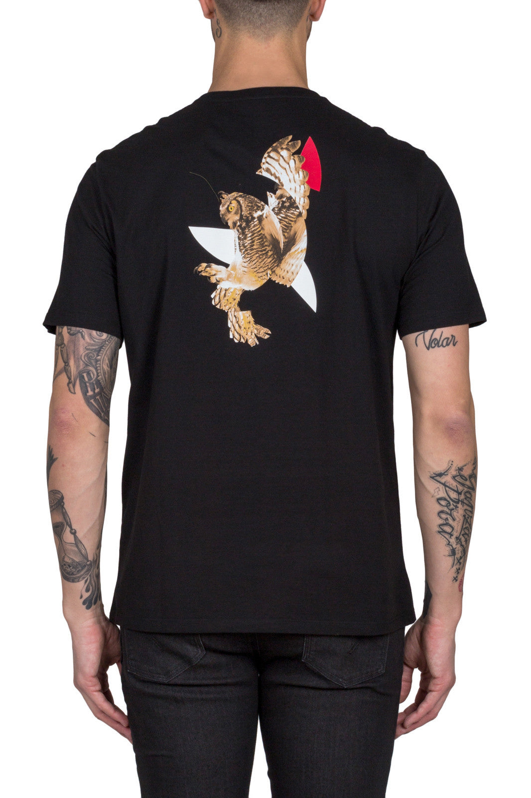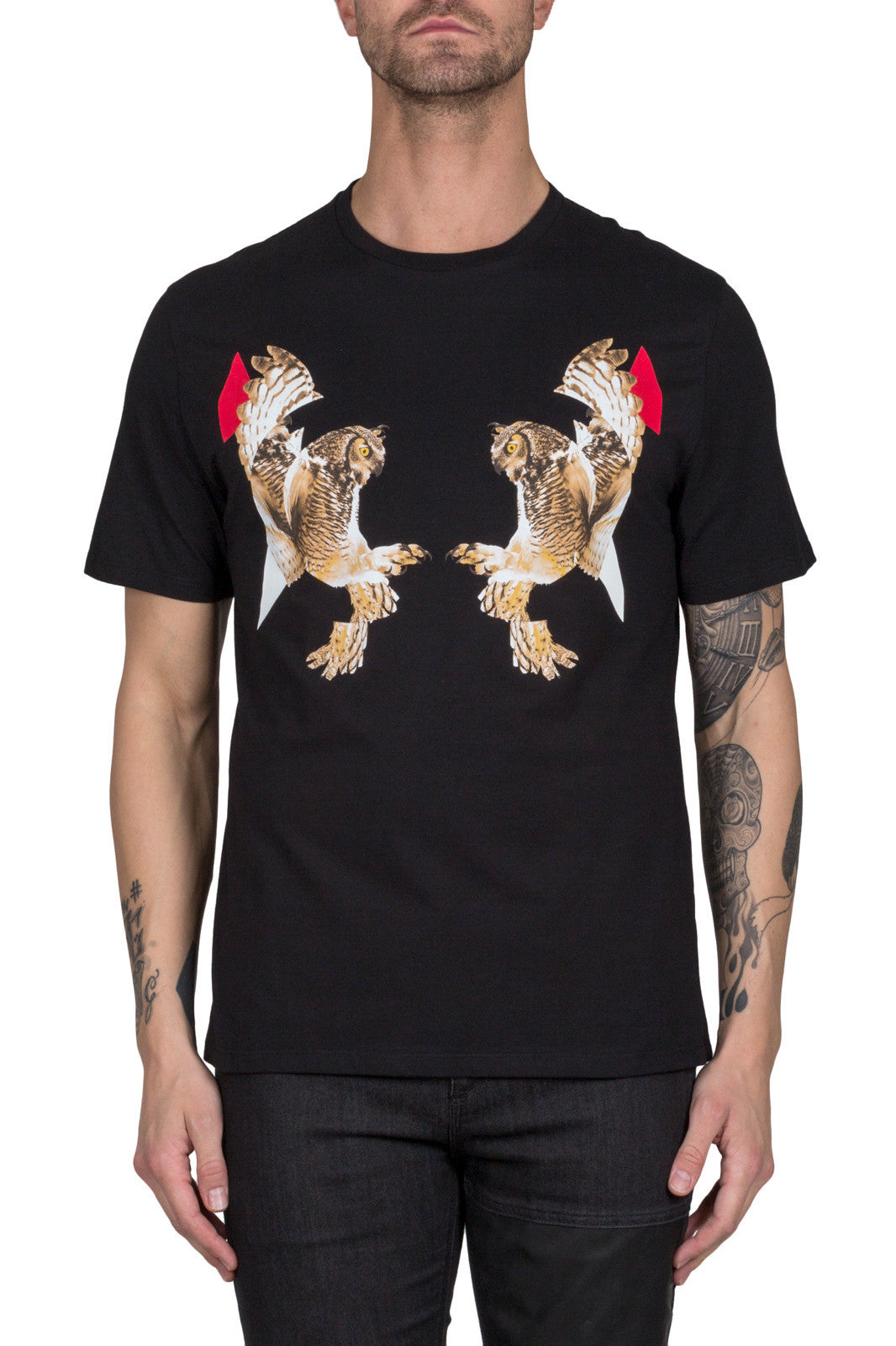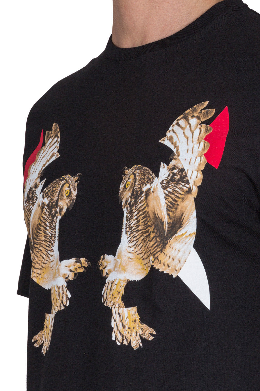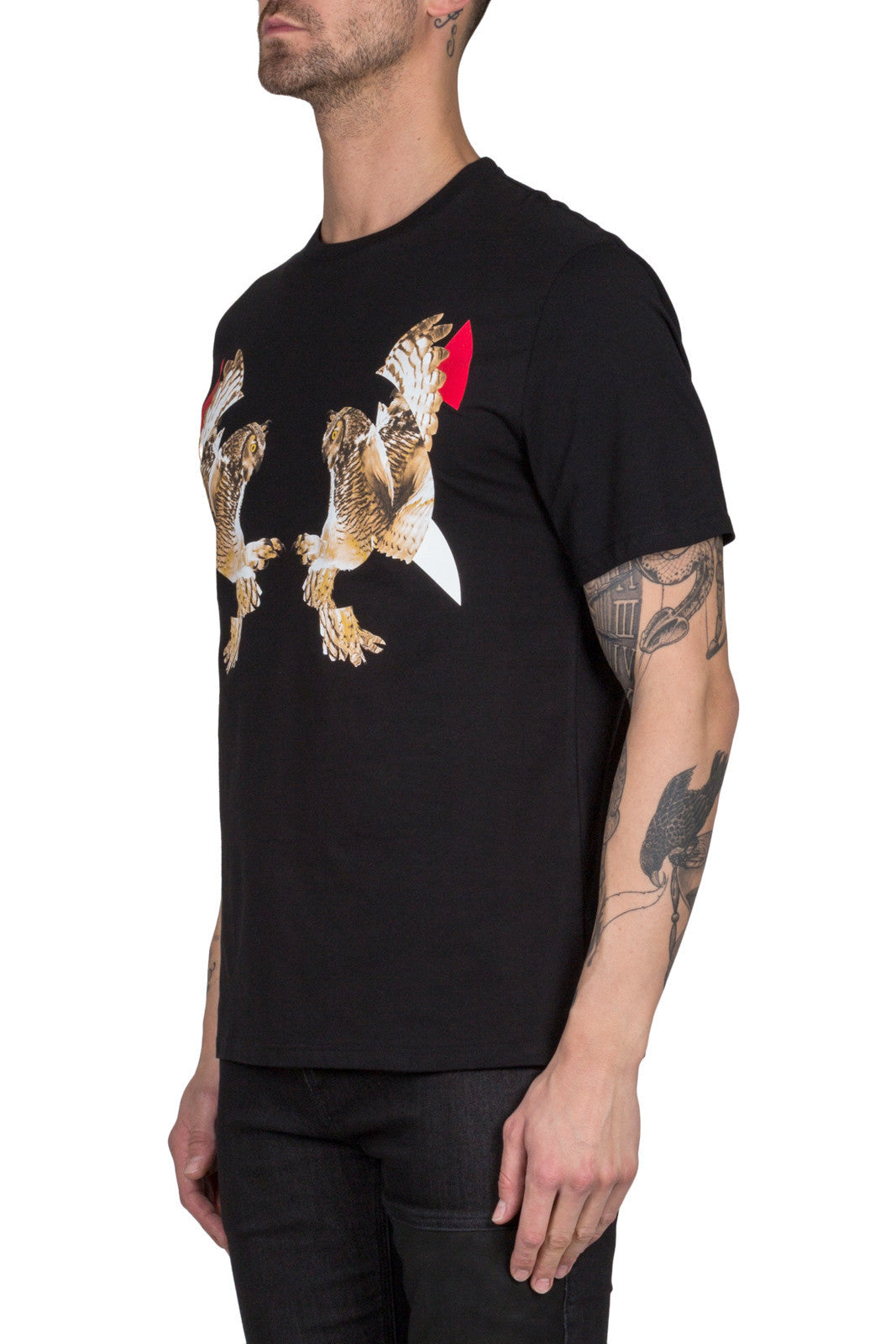 Black cotton double modernist owl t-shirt featuring a round neck and short sleeves from Neil Barrett