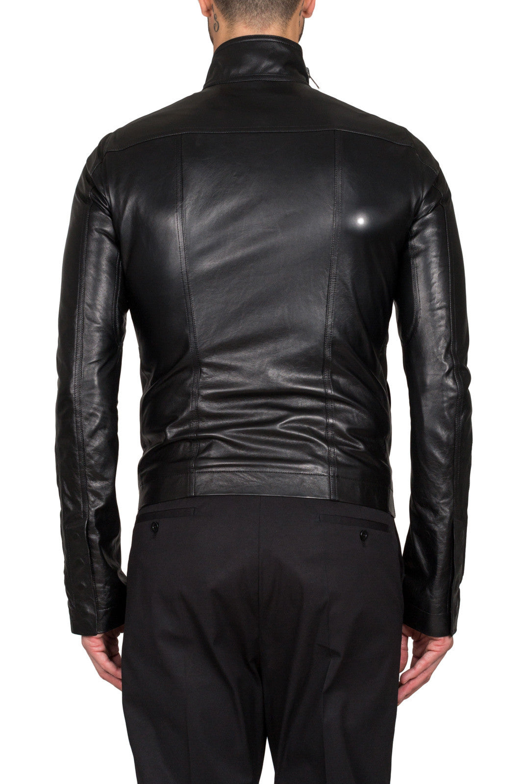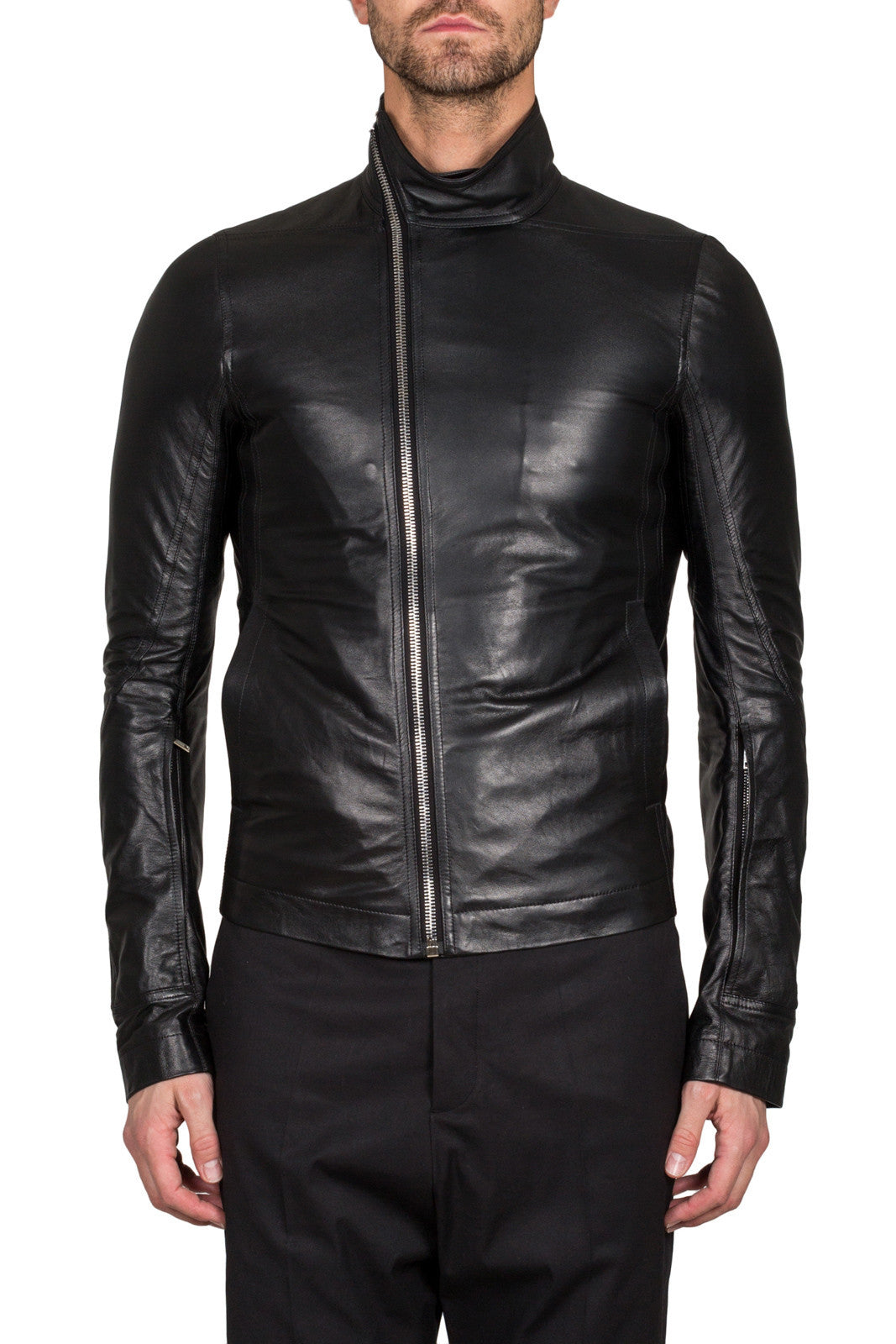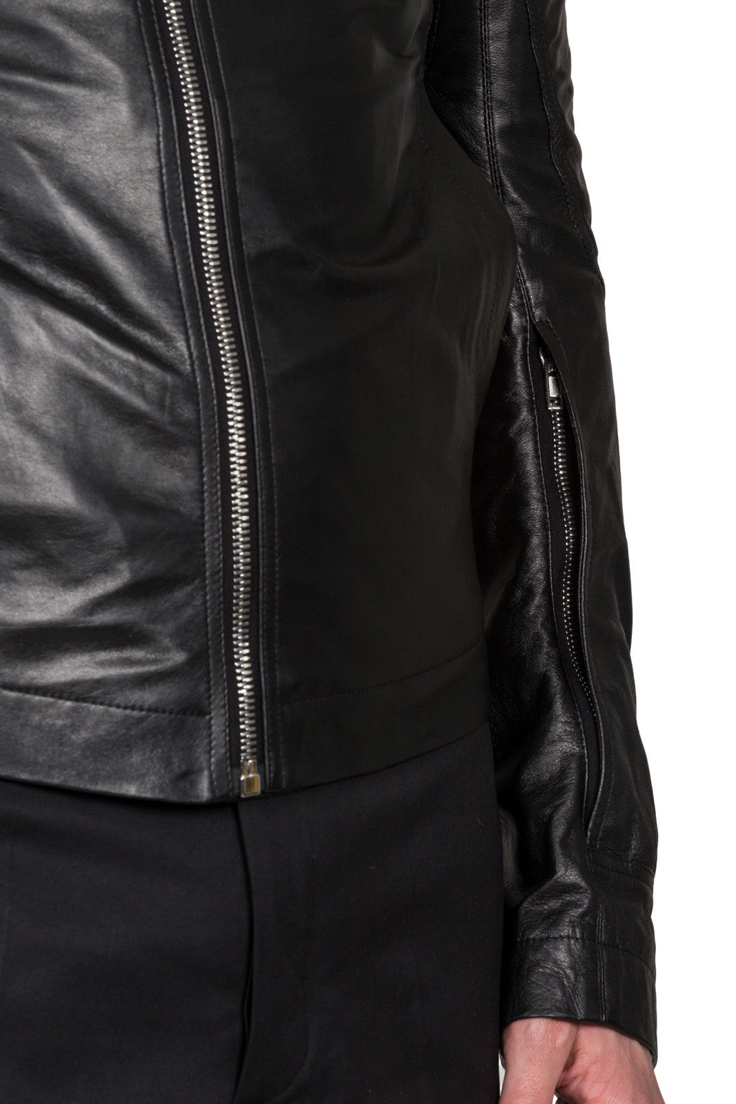 Black RU17S9762 LVT 09Rick Owens forever Mollino's biker jacket in black leather has an asymmetric zipper, three zipper, three zip pockets, one button pocket and a classic collar.