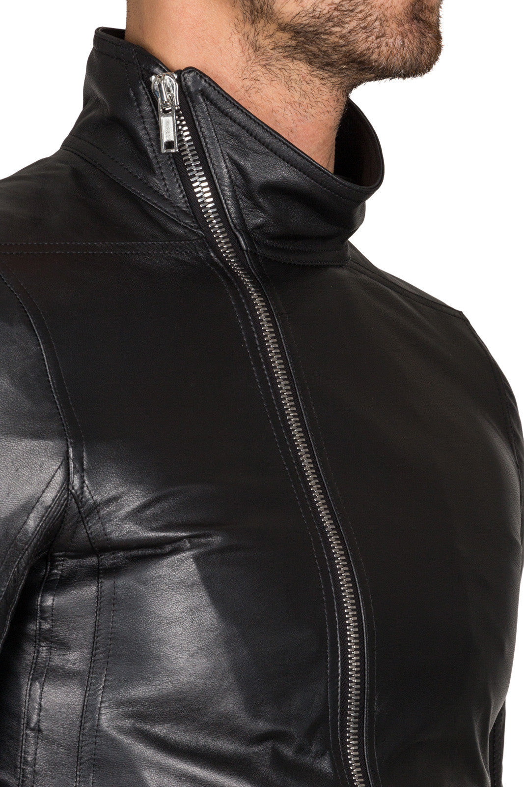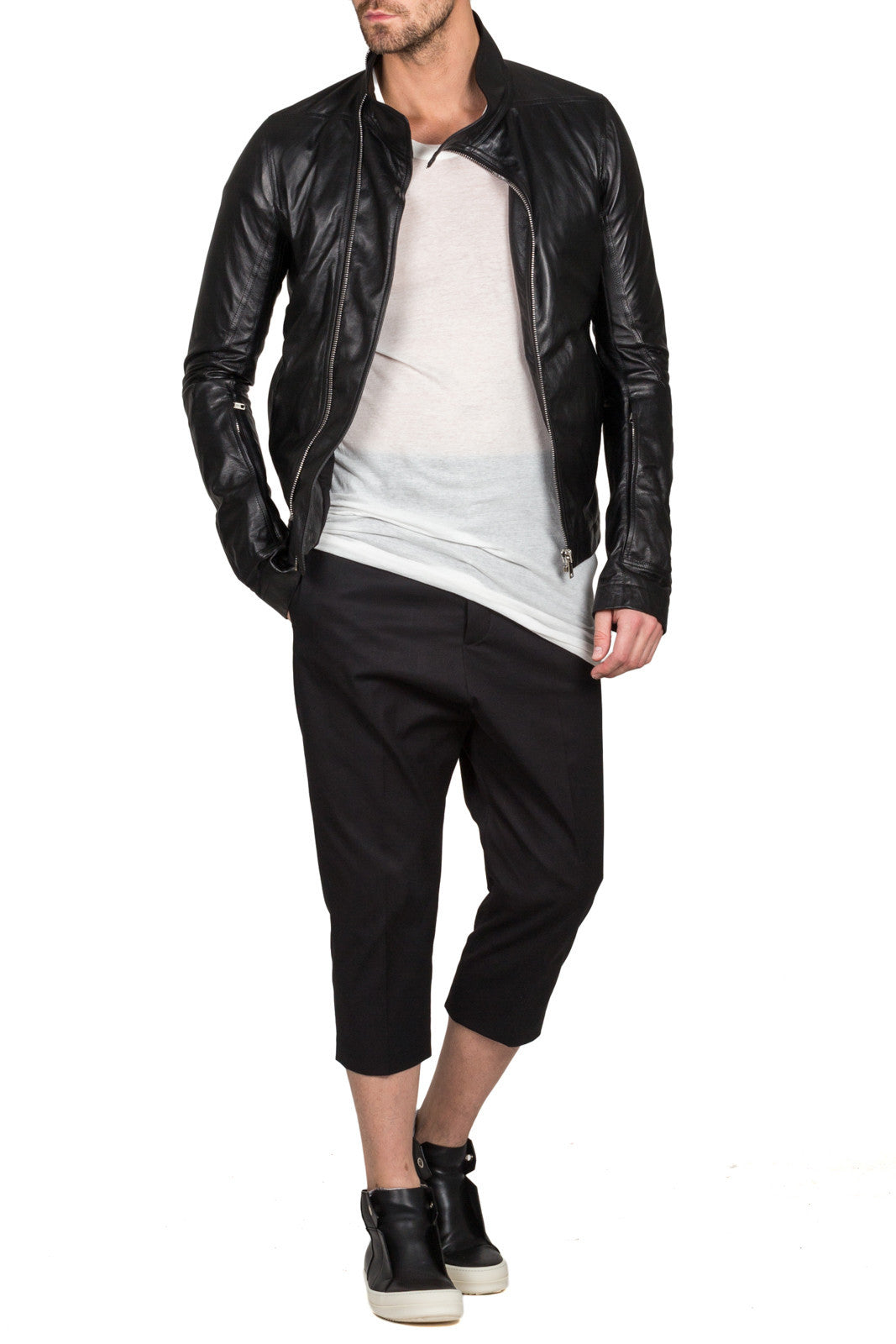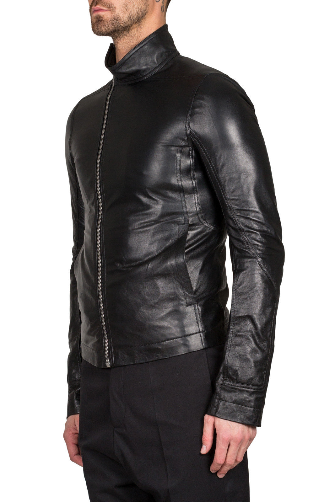 Black RU17S9762 LVT 09Rick Owens forever Mollino's biker jacket in black leather has an asymmetric zipper, three zipper, three zip pockets, one button pocket and a classic collar.