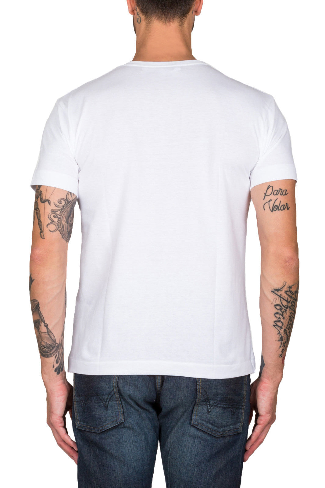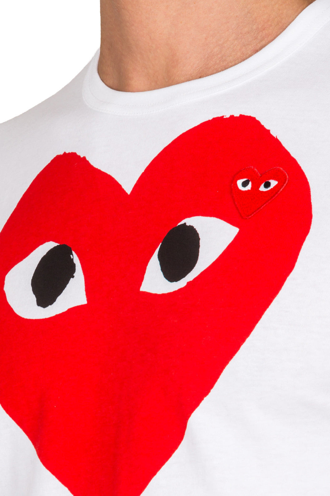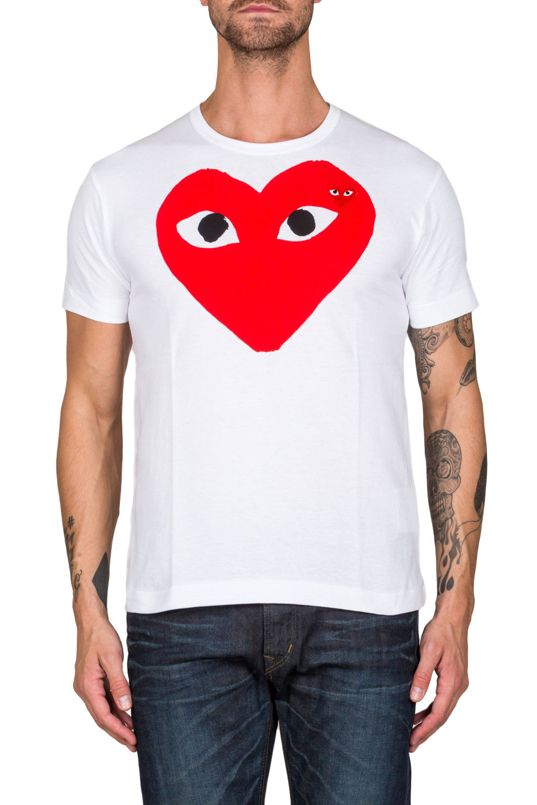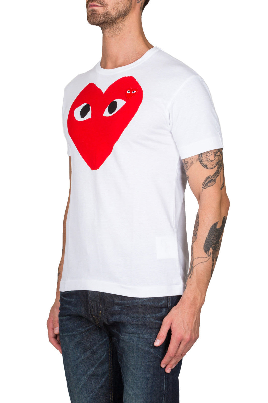 White cotton heart print T-shirt from Comme Des Garçons Play 100% Cotton Model is 190 cm and wears size L