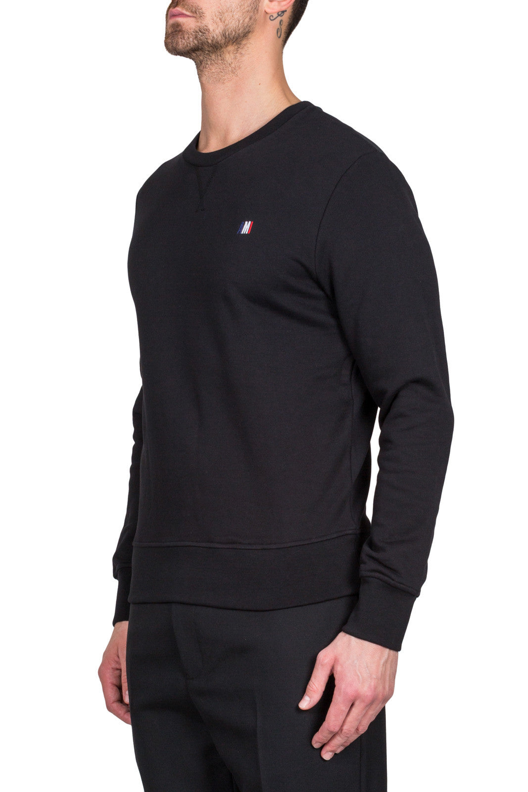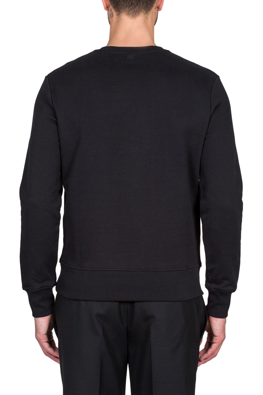 Black BSRJ003.73 001Classic crew neck sweatshirt in black cotton featuring long sleeves, a fitted hem and cuffs and a small embroidered tricolor Ami logo to the chest.