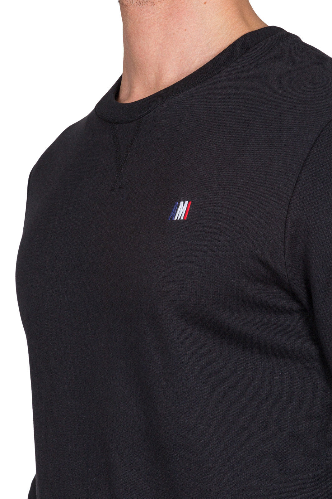 Classic crew neck sweatshirt in black cotton featuring long sleeves, a fitted hem and cuffs and a small embroidered tricolor Ami logo to the chest.