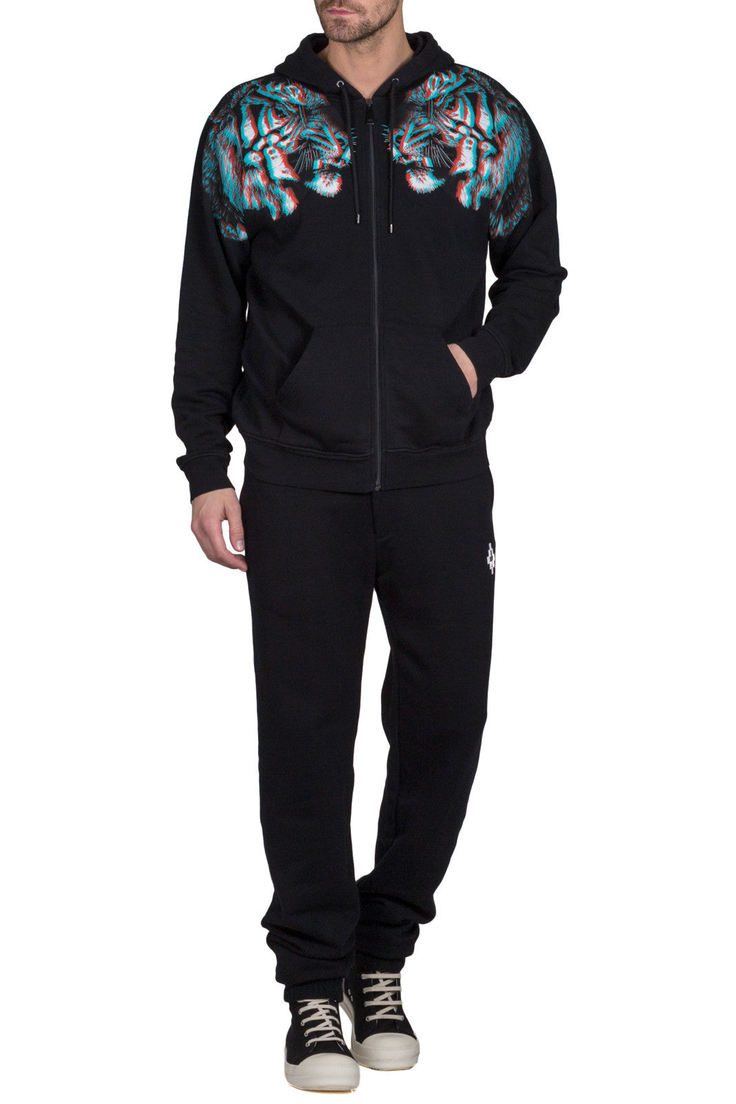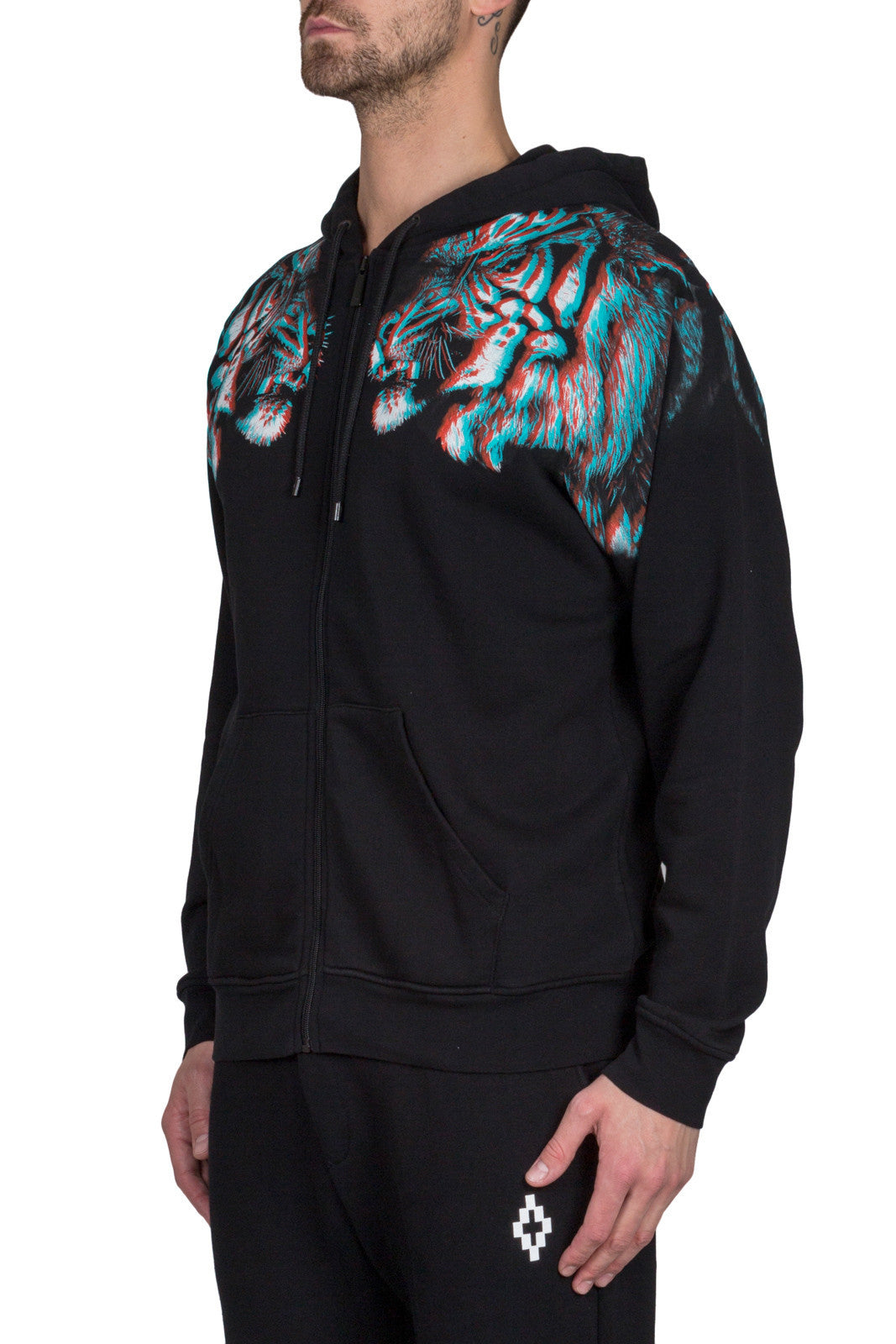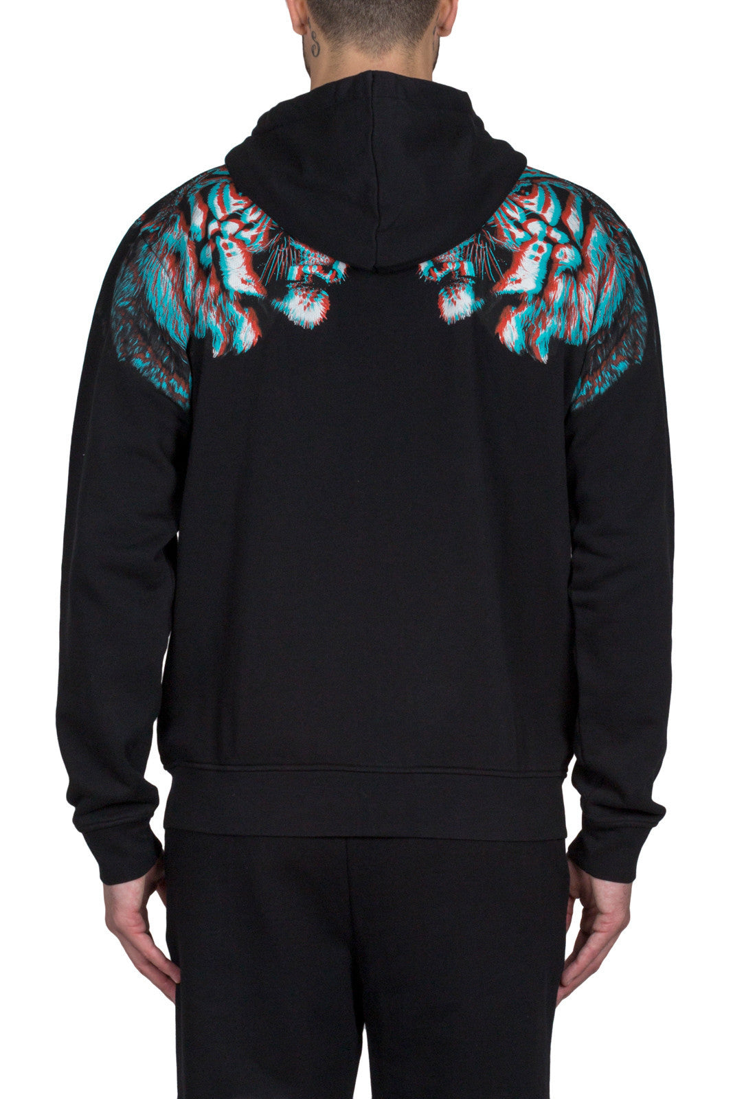 Black CMBB023S17068034 1088Black cotton tiger print zipped hoodie featuring a hood with drawstring tie fastenings, a front zip fastening, kangaroo pockets and 3D effect tiger prints at the front and back from Marcelo Burlon County of Milan.