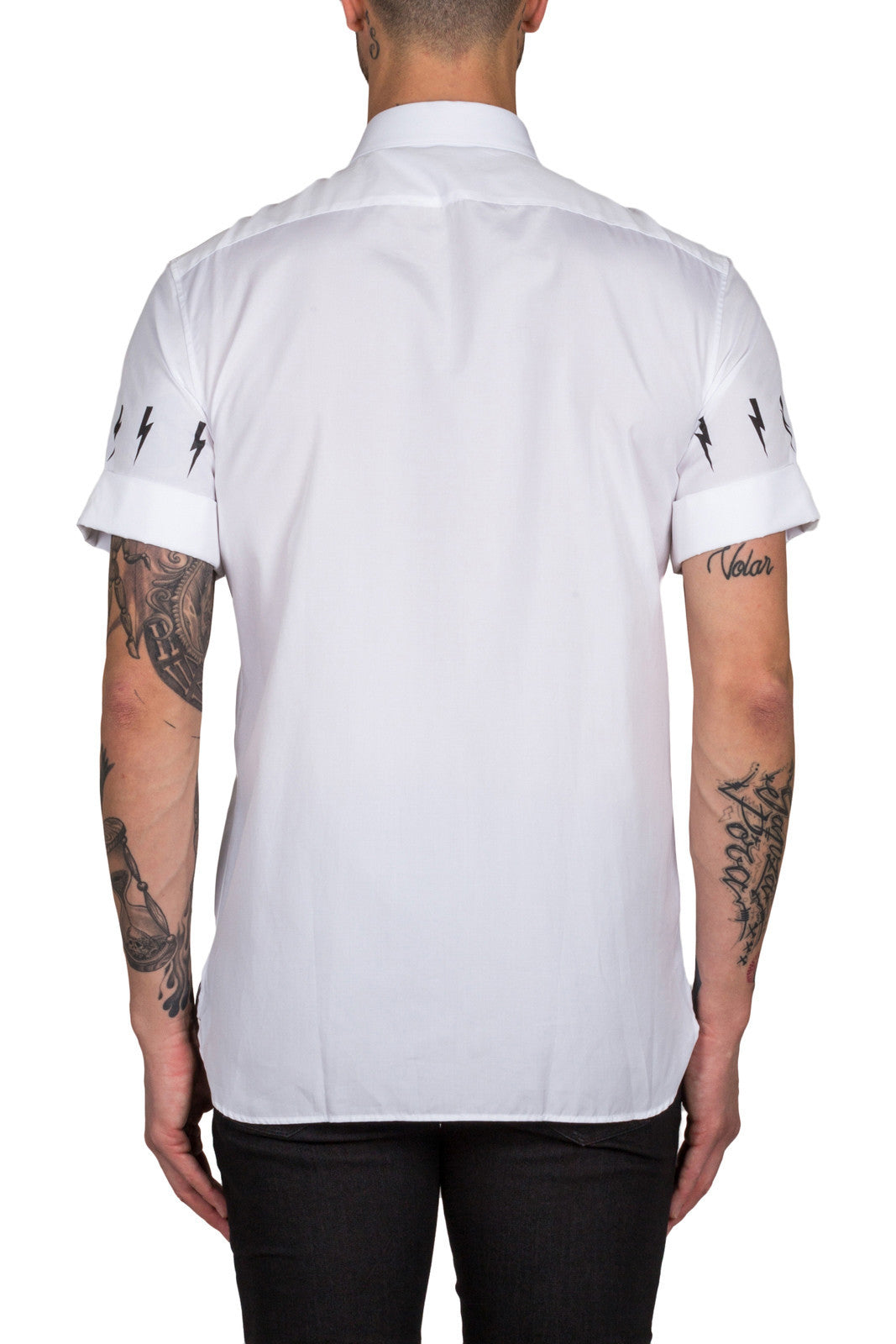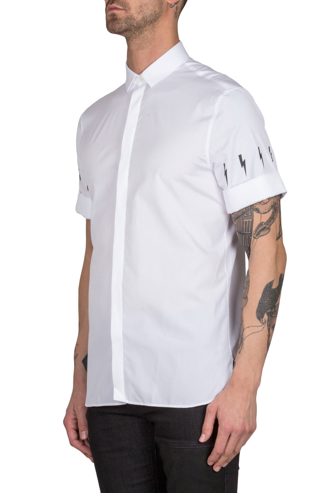 White PBCM660S E004S 526White and black cotton lightning bolt print shirt featuring a classic collar, a concealed button fastening, short sleeves and a curved hem from Neil Barrett.