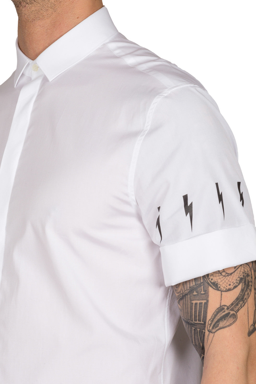 White and black cotton lightning bolt print shirt featuring a classic collar, a concealed button fastening, short sleeves and a curved hem from Neil Barrett.