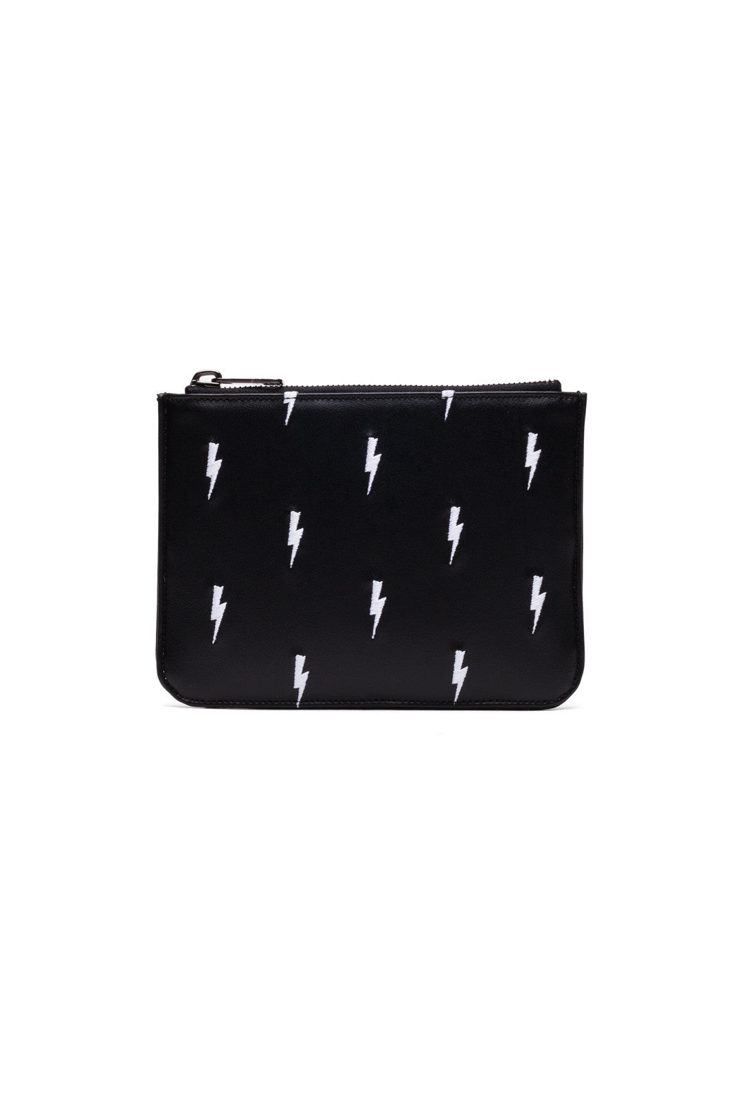Black BSG49T E9412 524Black leather lightning bolt print wallet featuring a top zip closure and an all-over print from Neil Barrett.