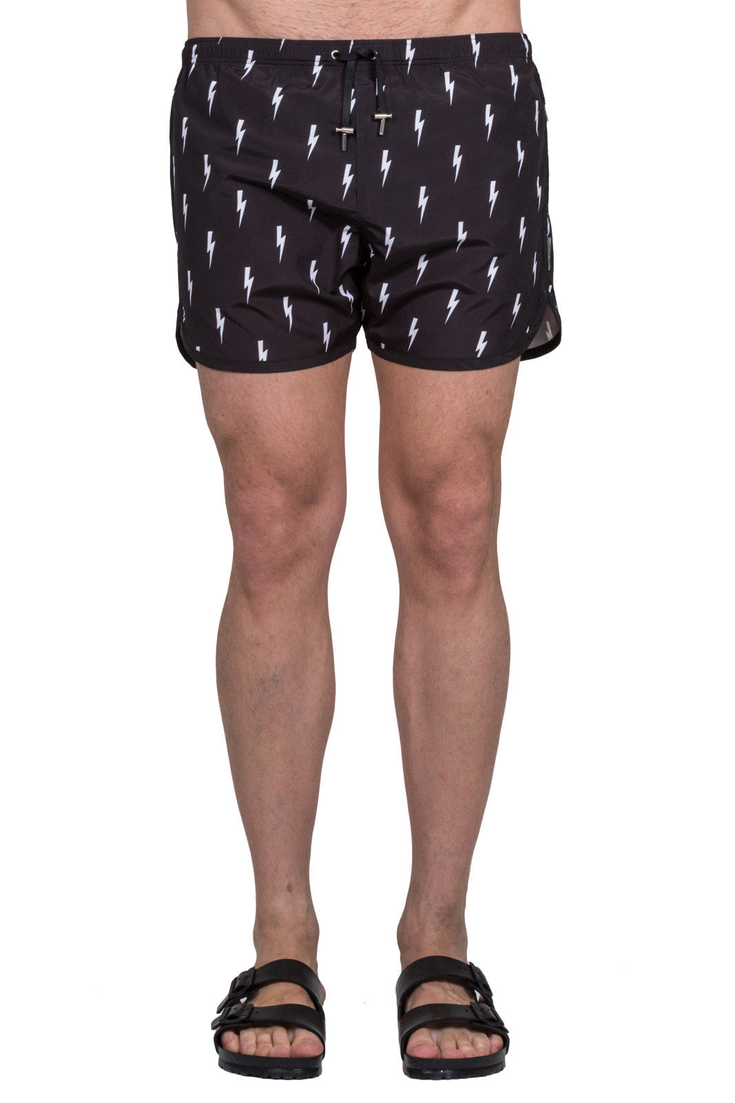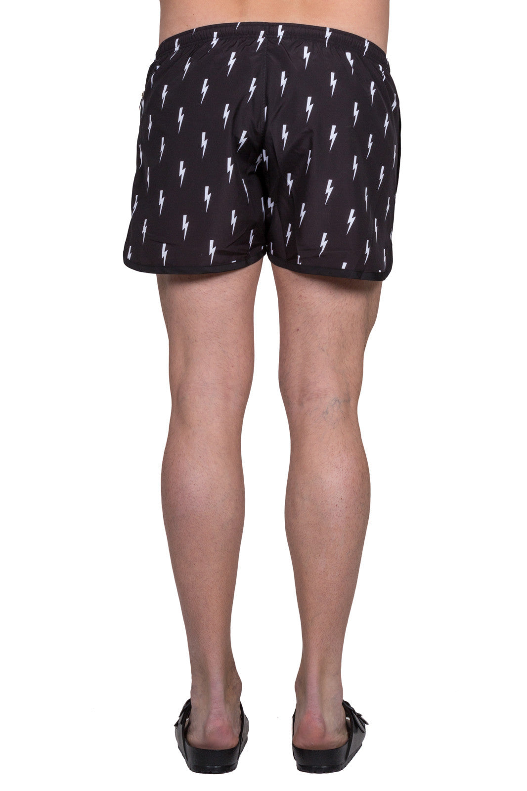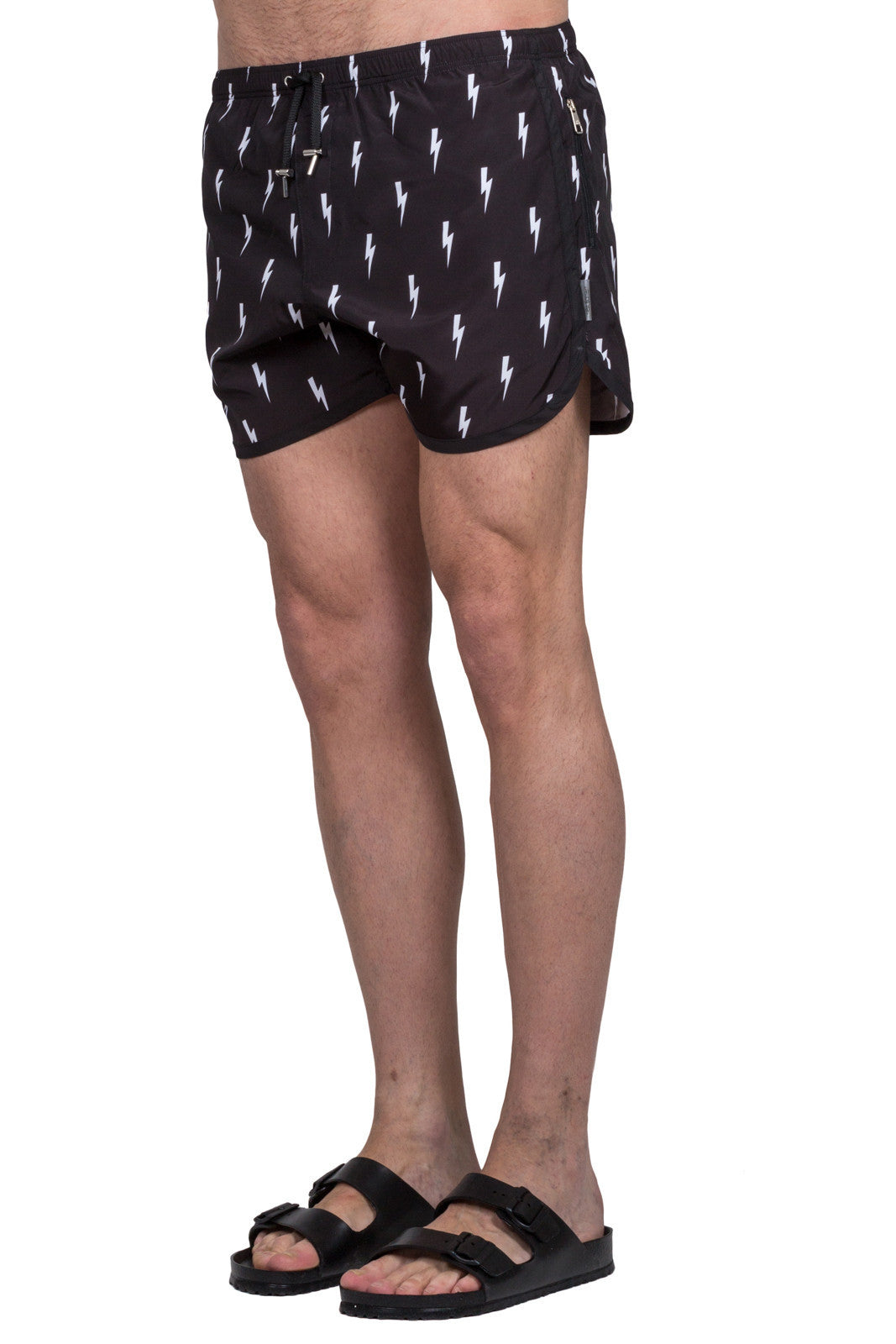 Black PBCB89O E035 524Black and white lightning bolt print swim shorts featuring an elasticated waistband with a drawstring fastening. Swimwear must be tried on over your own garments from Neil Barrett.