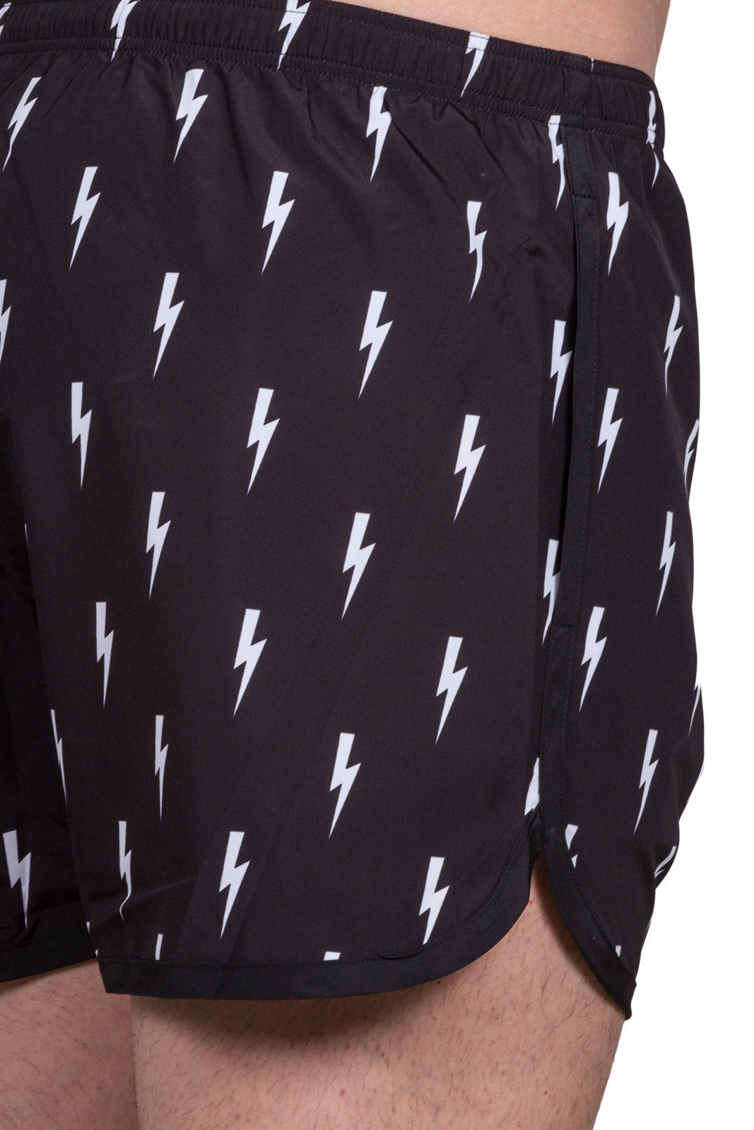 Black and white lightning bolt print swim shorts featuring an elasticated waistband with a drawstring fastening. Swimwear must be tried on over your own garments from Neil Barrett.