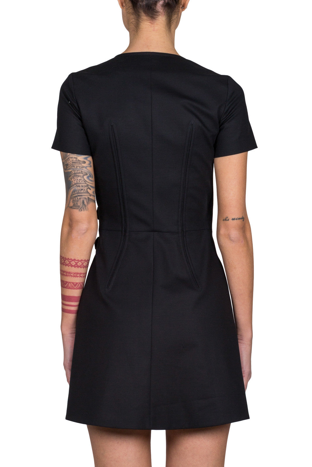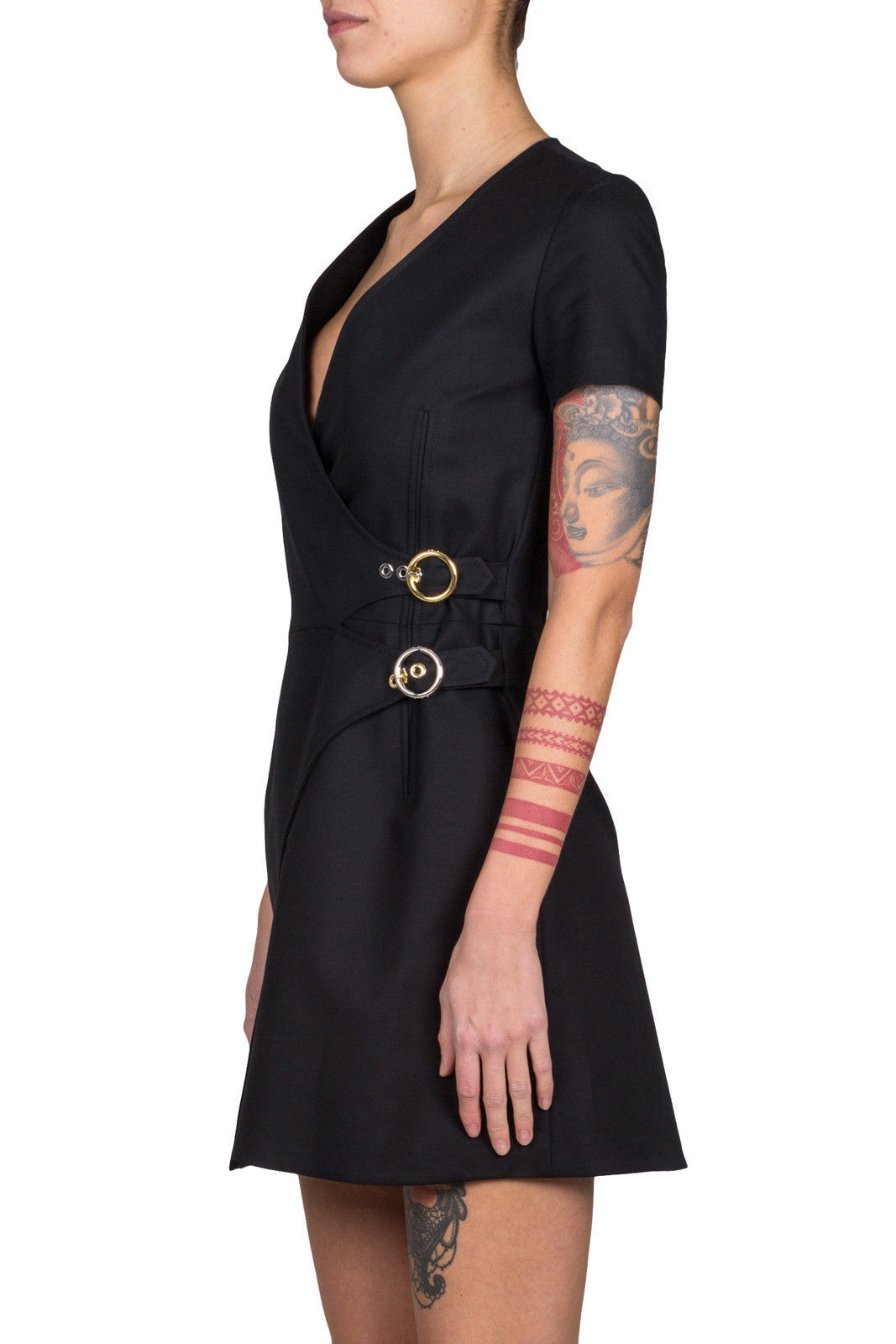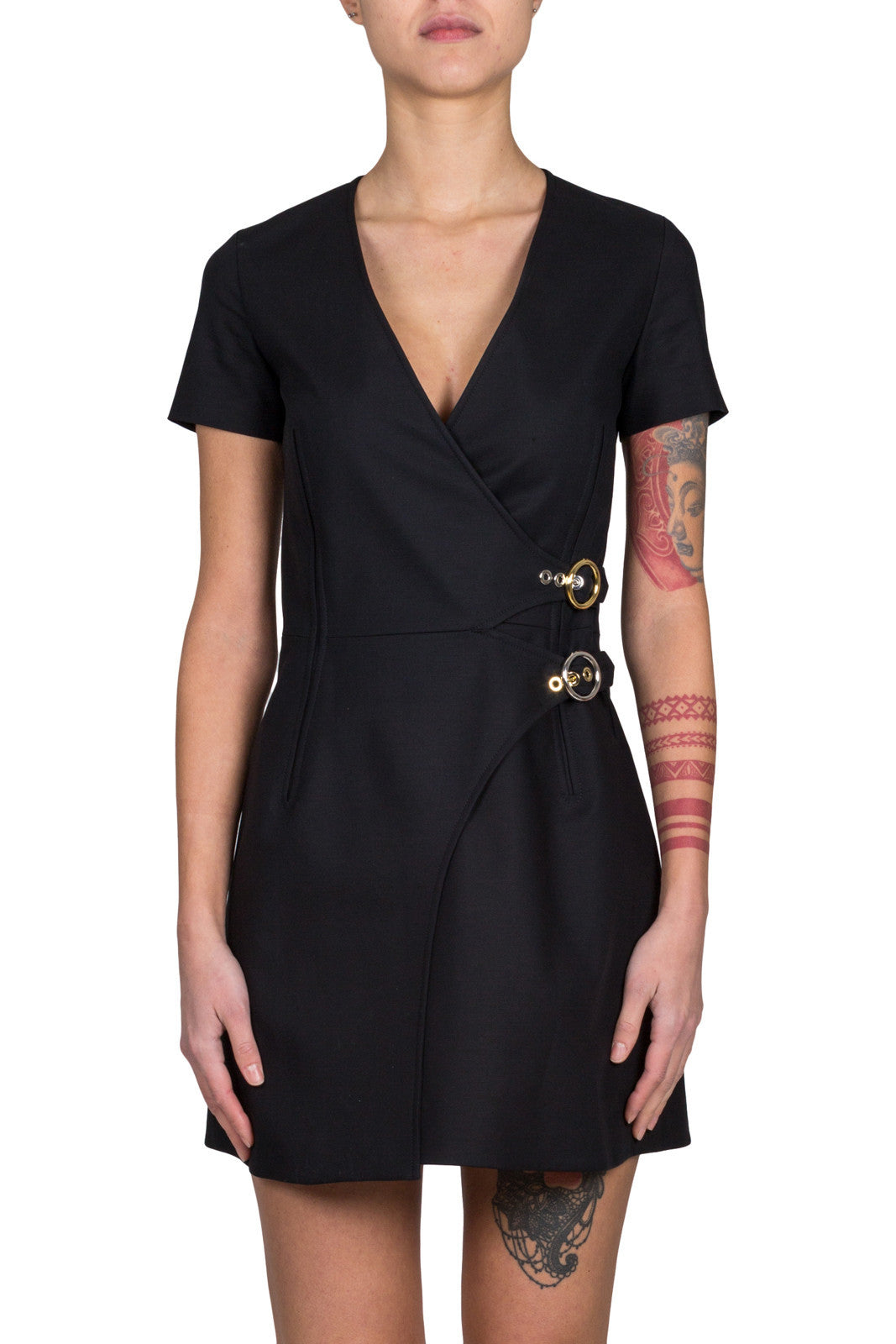 Black stretch cotton v-neck wrap dress from Kenzo featuring short sleeves and metallic side ring closures.