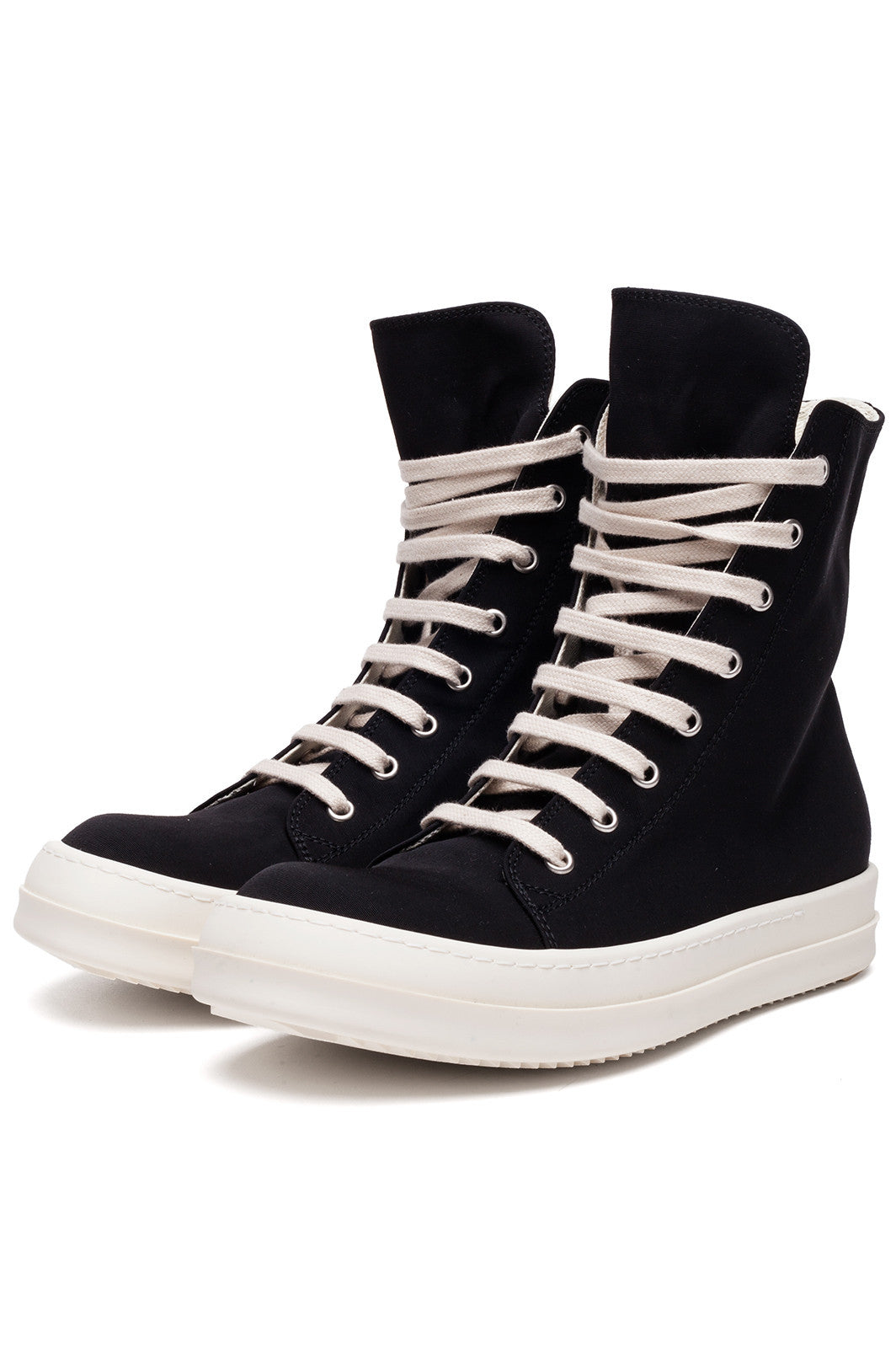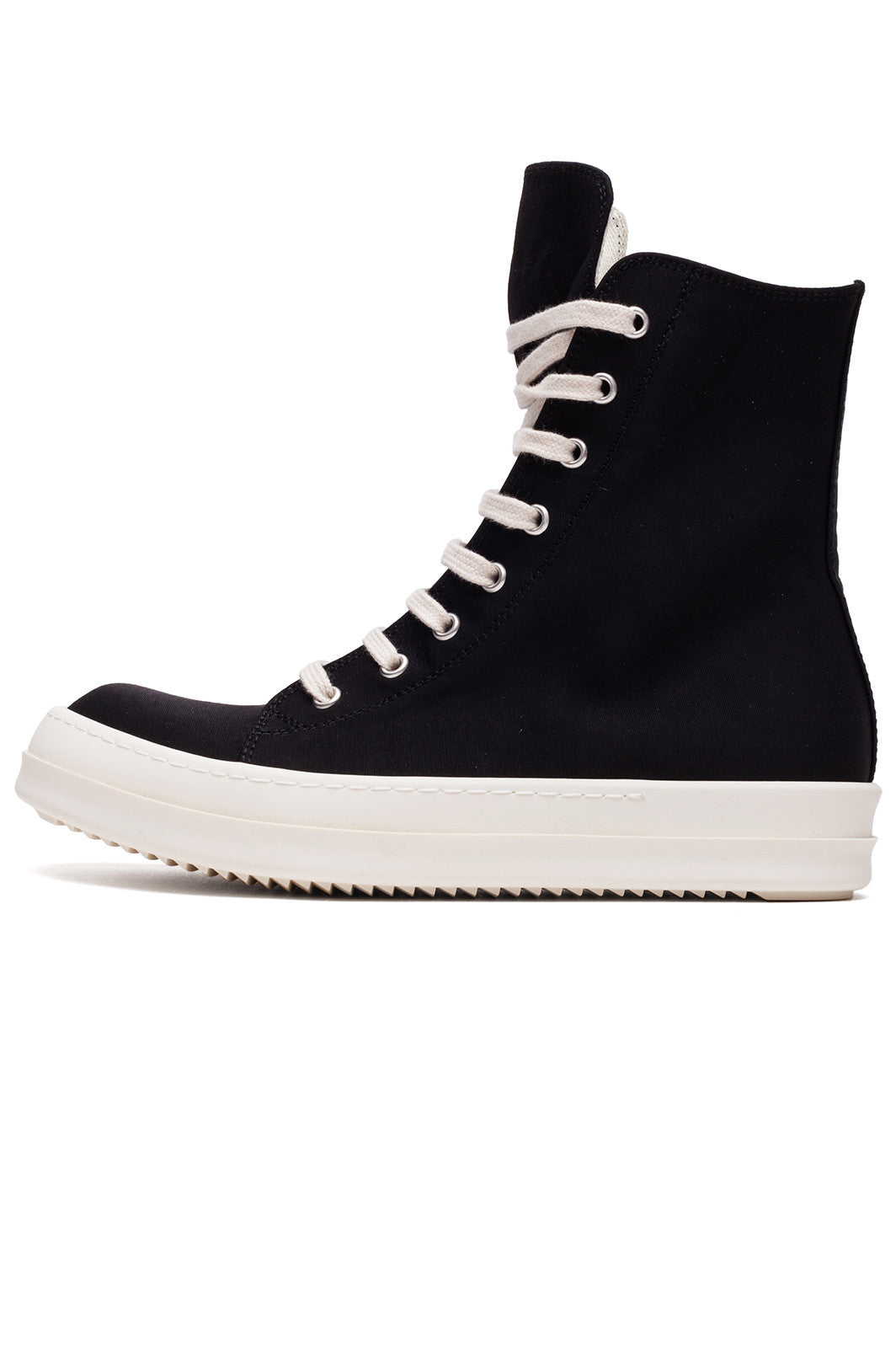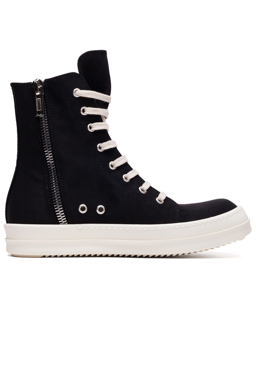 Rick Owens DRKSHDW Vegan Sneakers in black have eight-eyelet lacing, a side zipper and a white shark-tooth soles.