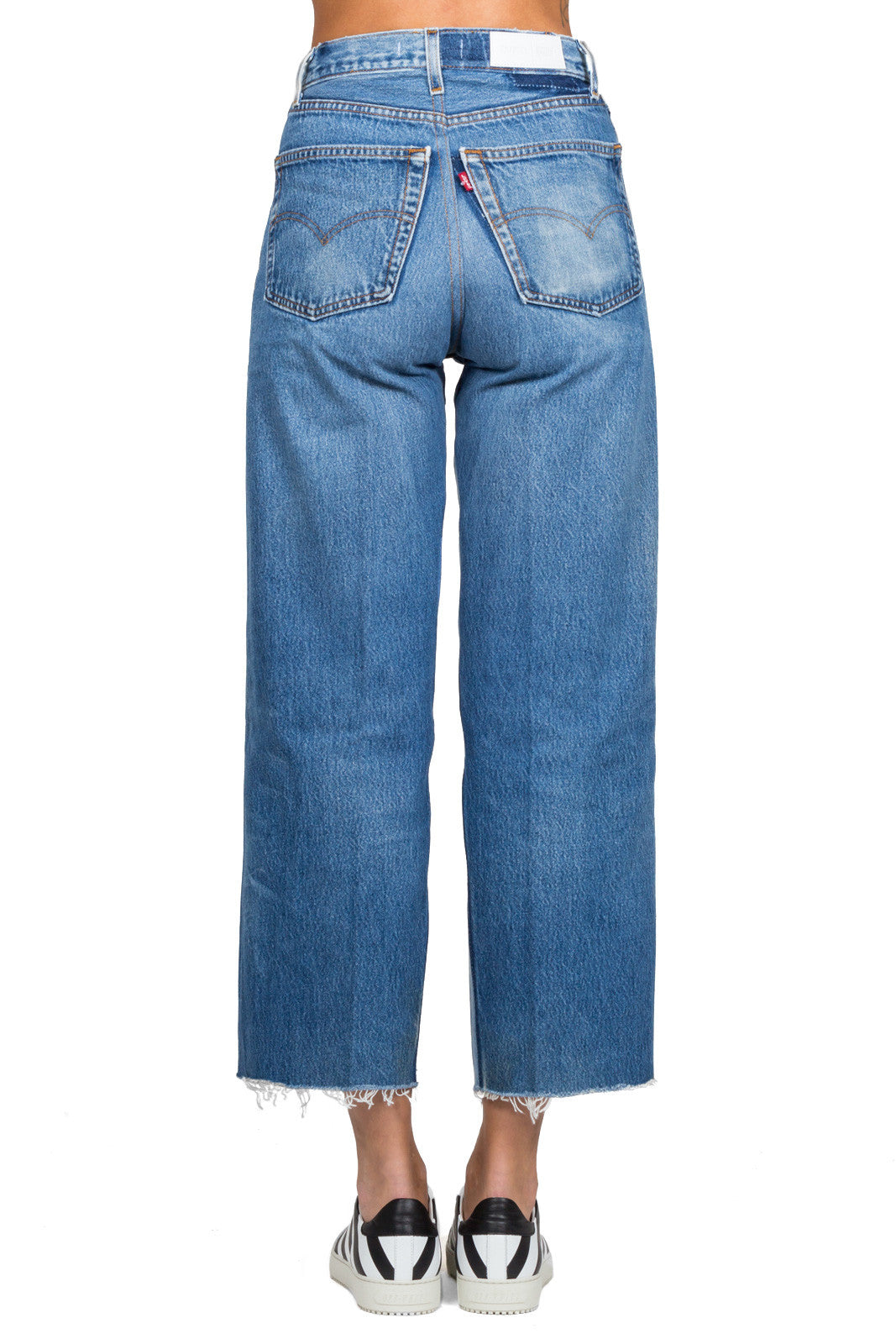 Blue cotton panelled cropped jeans featuring a high rise, whiskering at the thigh, a button and zip fly, belt loops, a five pocket design and a wide legfrom RE/DONE. 100%Cotton Model is 175 cm and wears size 26